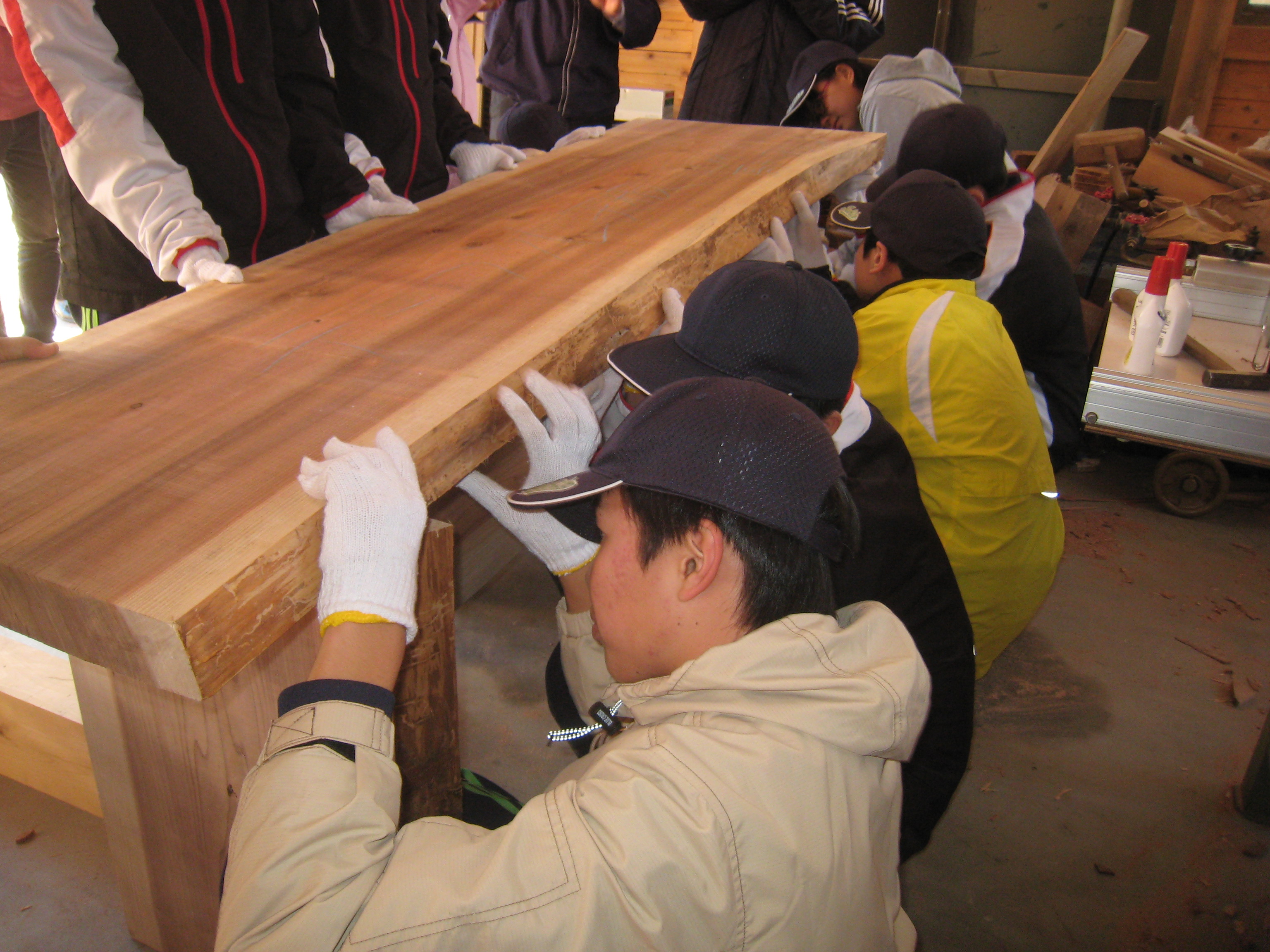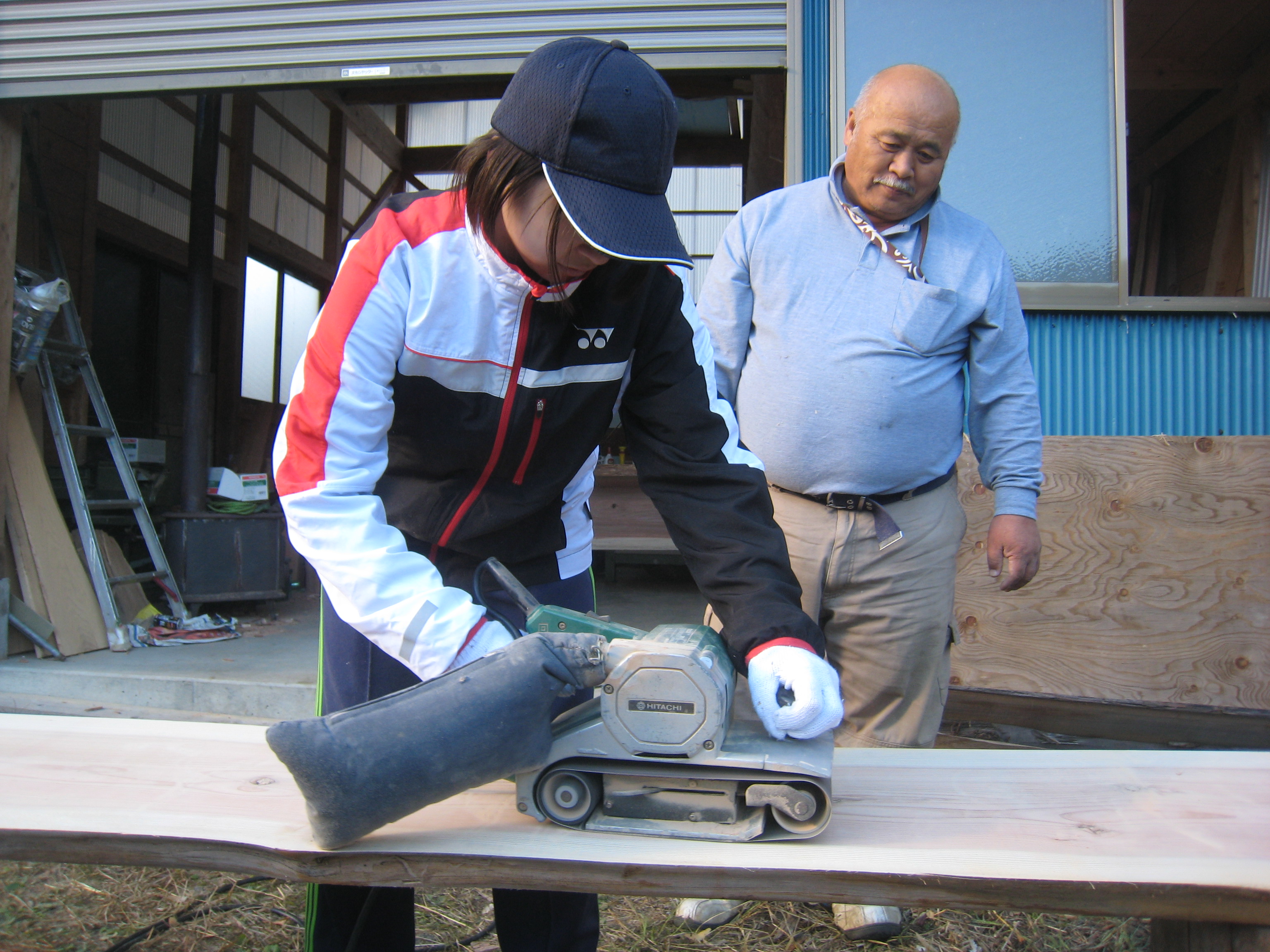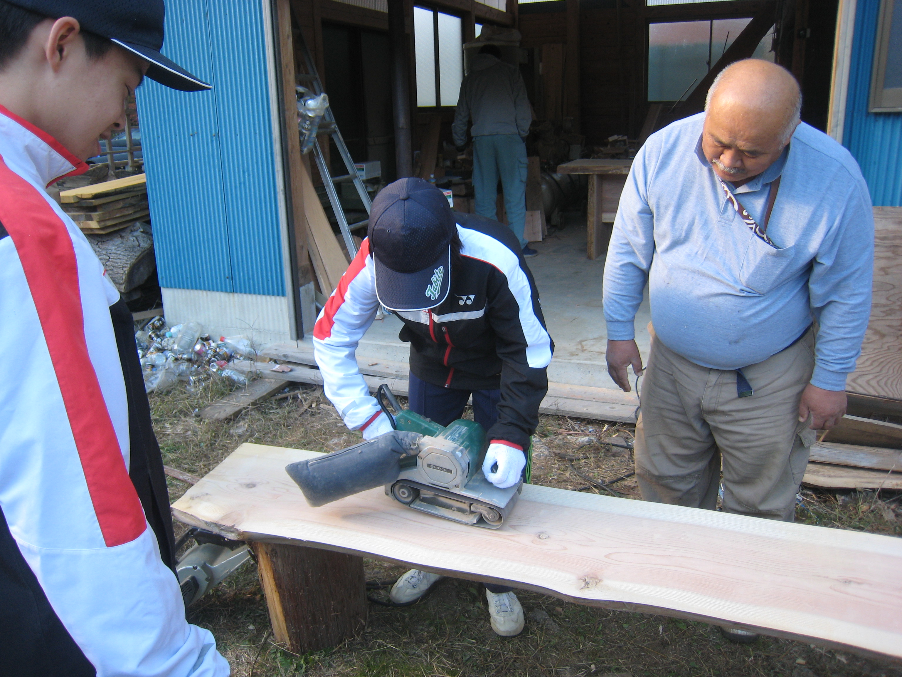 次回はテーブルの「仕上げ」と、ベンチの「組み立て」です。次回の仕上げに備えて、最後にグラインダーを使う練習をしました。