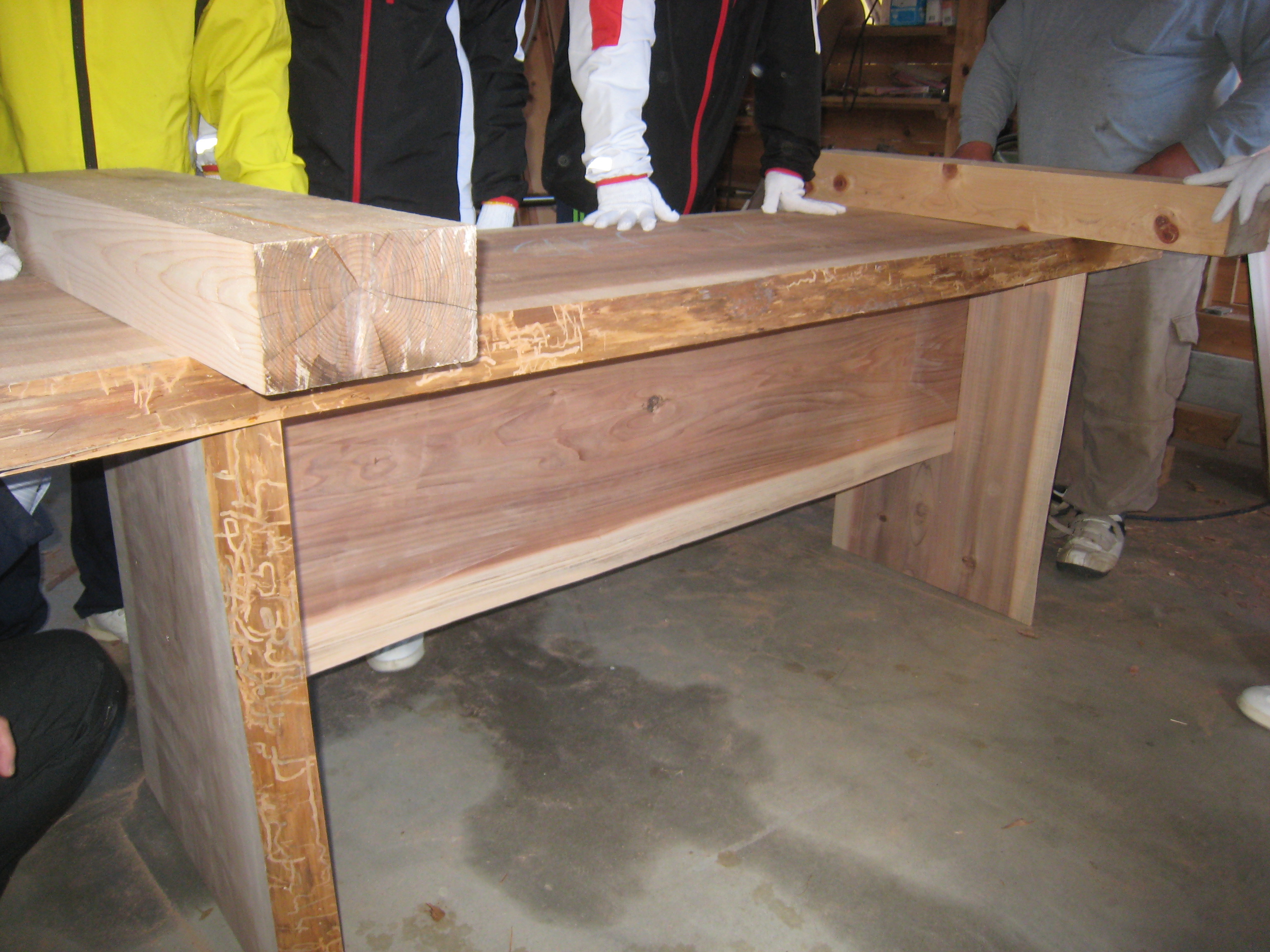 テーブルの完成!。男子4人が乗ってもびくともしません。