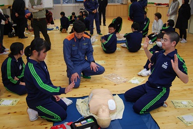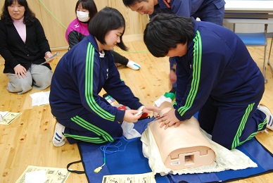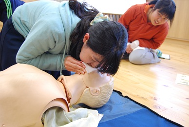 本日、中学生、小・中教職員による救急救命講習会を行いました。心肺蘇生法として胸骨圧迫、気道の確保、人工呼吸、AED使用法などを学びました。