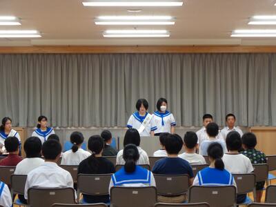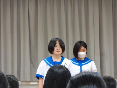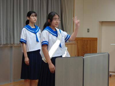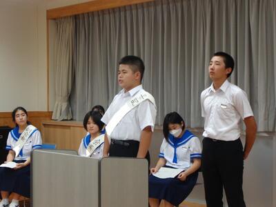 19日、後期生徒会役員に立候補した3名の立会演説会を、選挙管理委員会のもと集められた小4~中3で行いました。