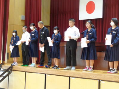 2日には全校朝会にて後期生徒会役員の任命式があり、生徒会執行部や各専門委員会の委員長、学級委員長の皆さんが校長先生より任命状をいただきました。
