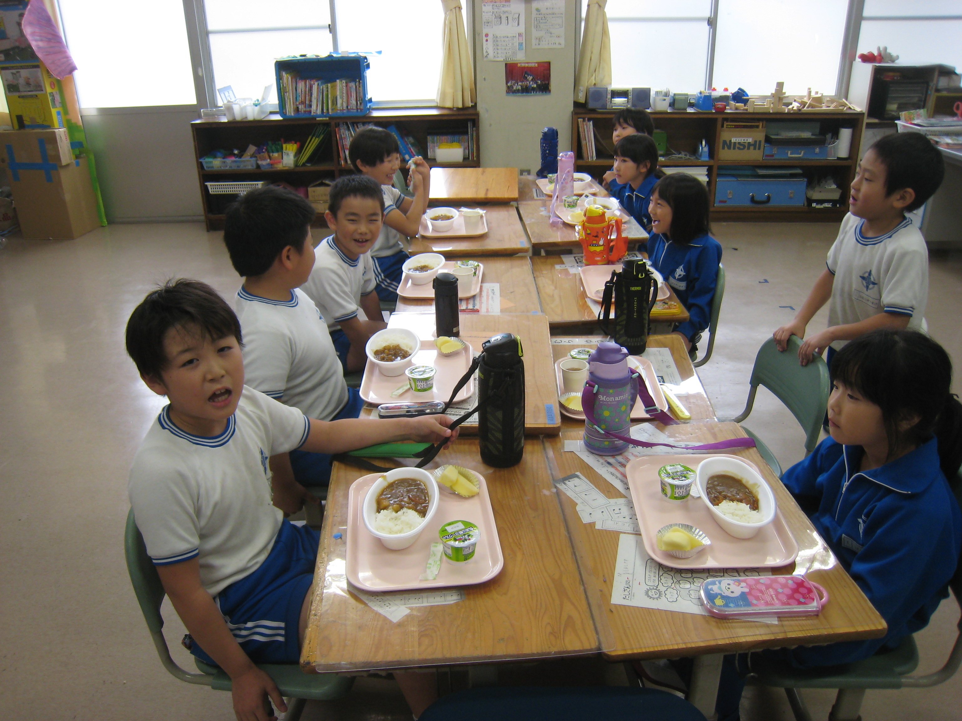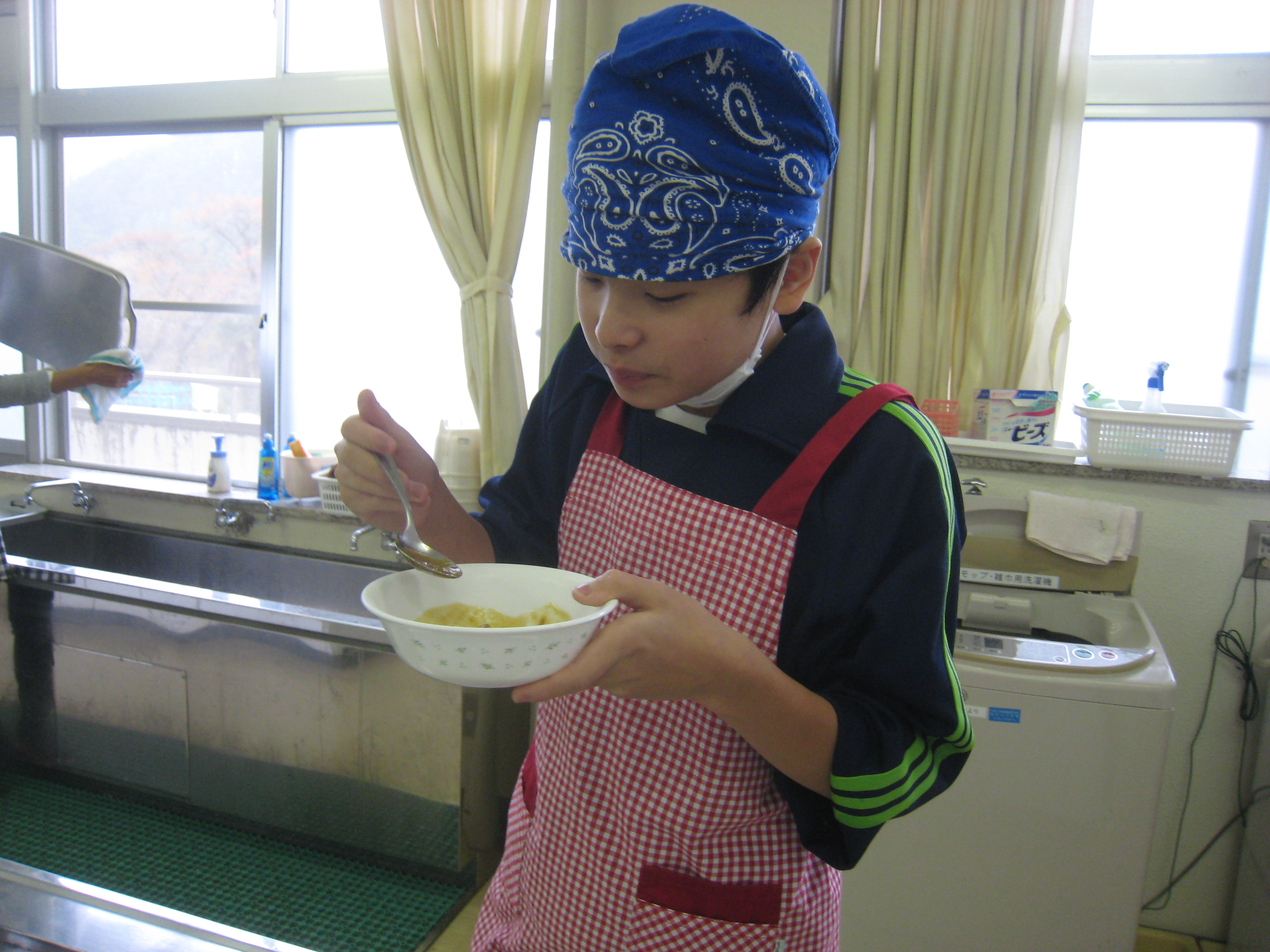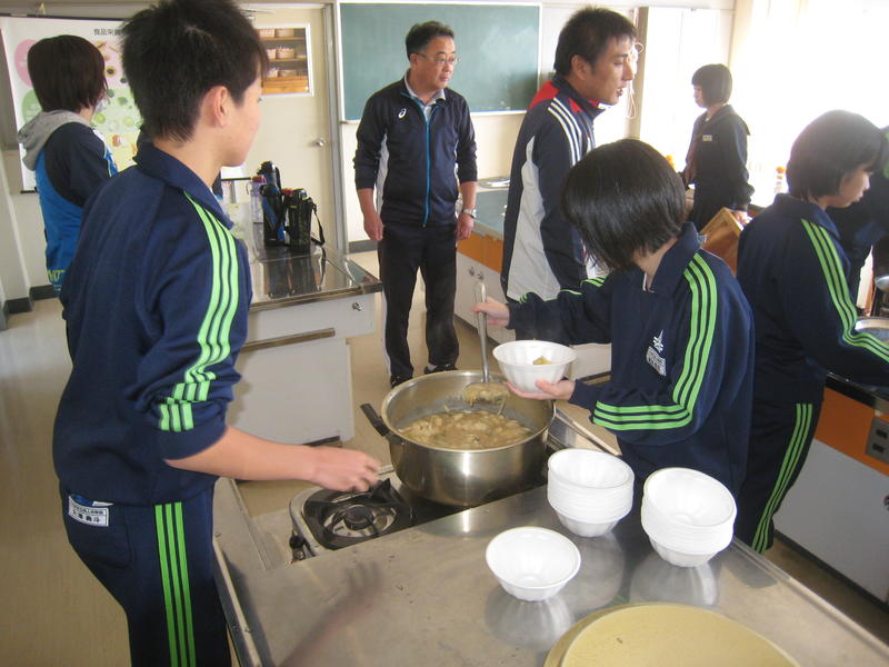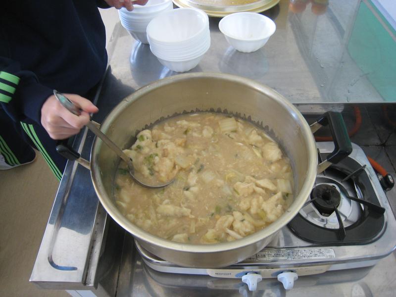 今日、小学校生は、地域のお年寄りとふれあう「地域交流会」でした。小学生が掘った自然薯を使って、地元婦人会の方々が「自然薯汁」を作ってくださったので、昼食にそれをいただきました。カレーも作ってくださり、みかん・プリンとともに、お腹いっぱいになるまで自然薯汁の昼食を楽しみました。