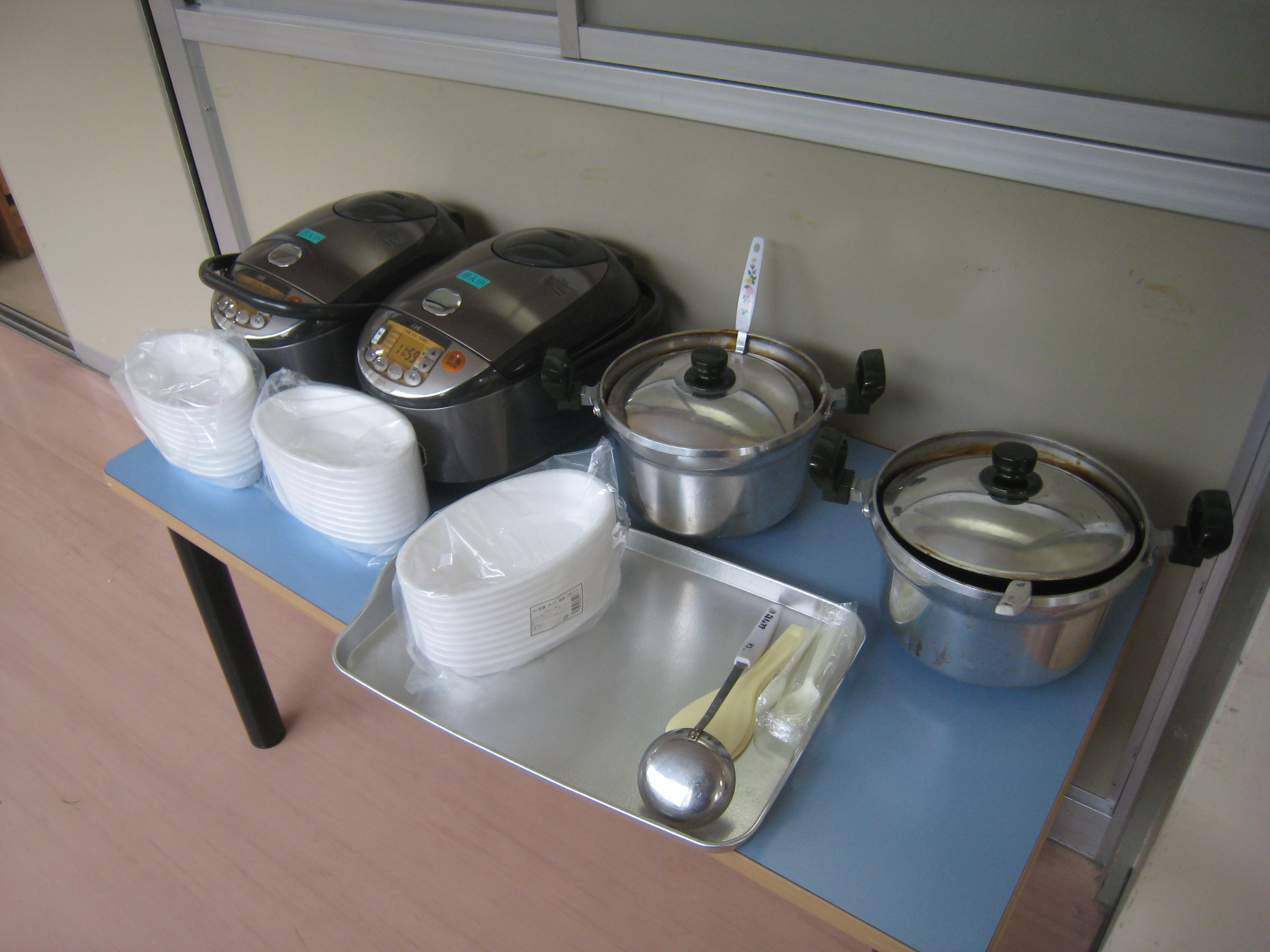 ごはんも炊けて、カレーもほどよくできあがりました。先生方も一緒に配膳の準備です。
