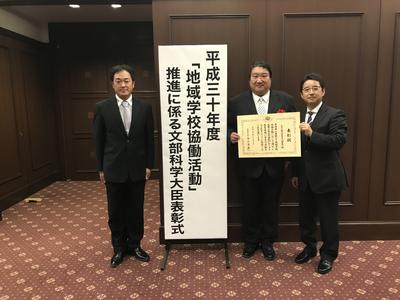 12月3日(月)文部科学省において、「地域学校協働活動」に係る文部科学大臣表彰式があり、本校学校運営協議会委員長、副委員長、校長の3人が出席してきました。