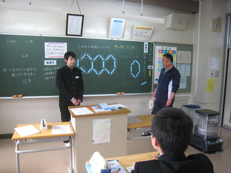 平成29年度の全国学力・学習状況調査の問題を題材にして授業を行いました。1年生5名は、提示された課題に真剣に向き合い、グループでの検討や全体での発表を通して、数学的な思考を深めていました。