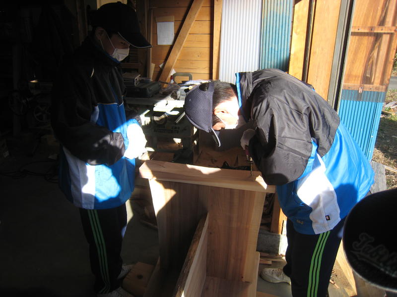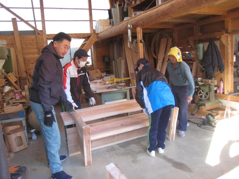 今日の作業は、「テーブル・ベンチへの足付け」と「ベンチ背もたれへの校名入れ」です。