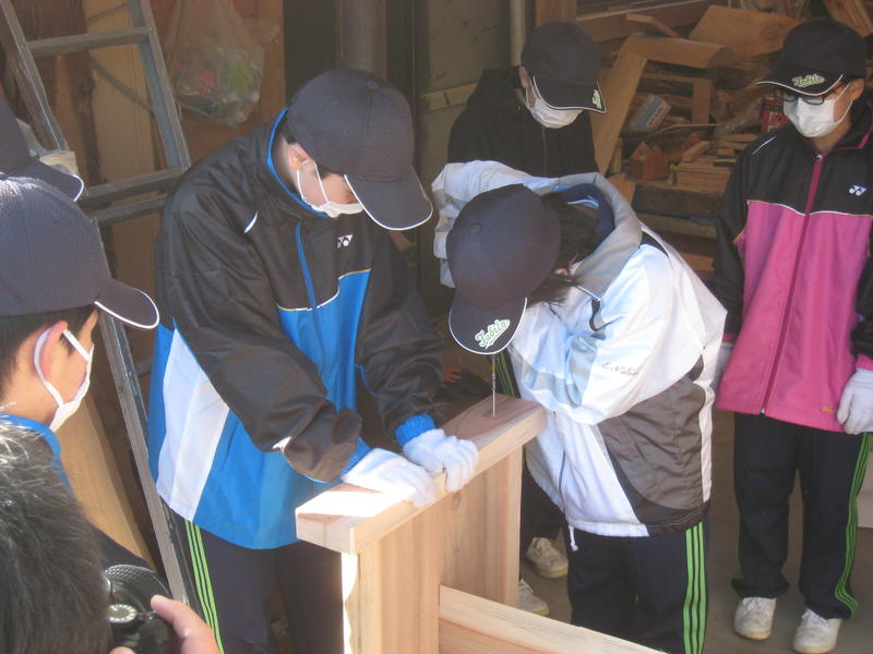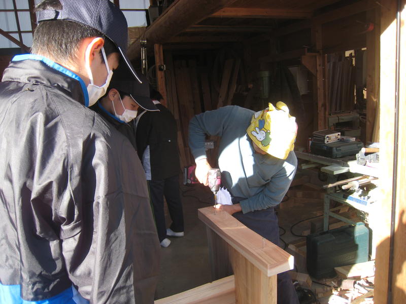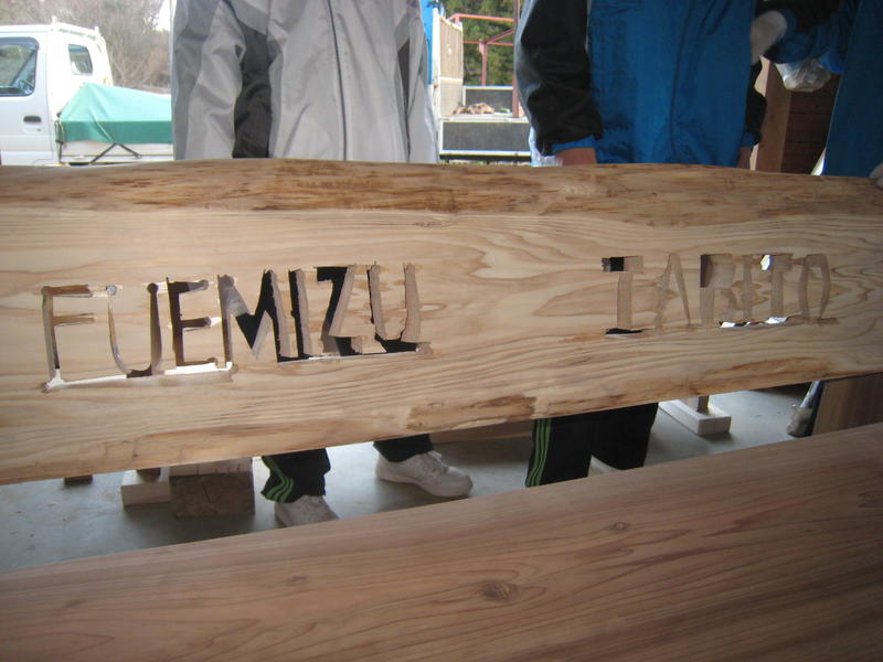足付けは1・2年生が担当し、作業所の佐藤さんが準備してくださっていた部材を、テーブルとベンチに接合しました。ベンチへの校名入れは3年生が担当しました。田人林研の緑川さんがベンチの背もたれにドリルで穴を空けてくださり、それをまねて3年生が穴を空け、その後、電動のこぎりを使って、「TABITO」「FUEMIZU(宮崎県都城市立笛水小中学校)」と校名を掘って刻みました。