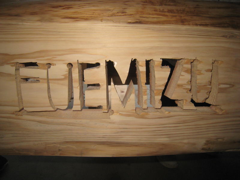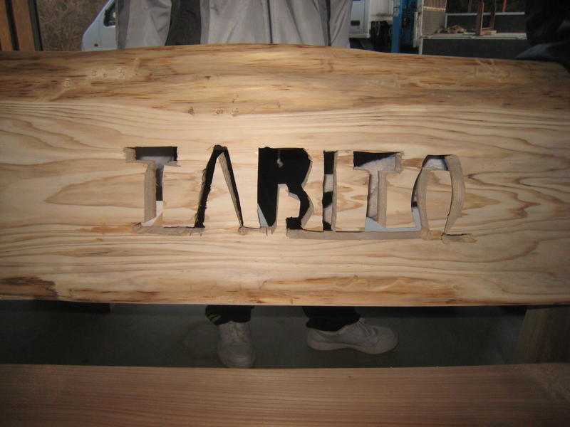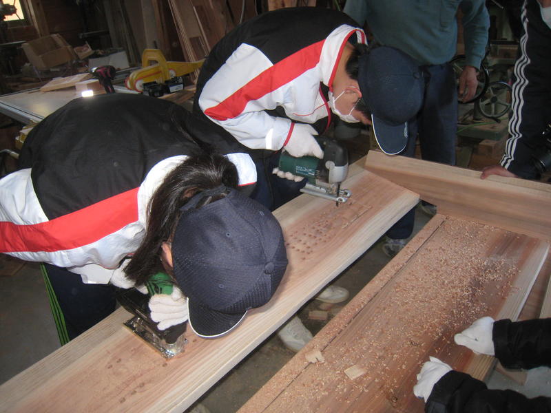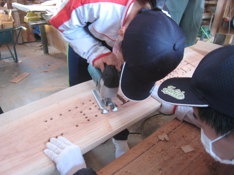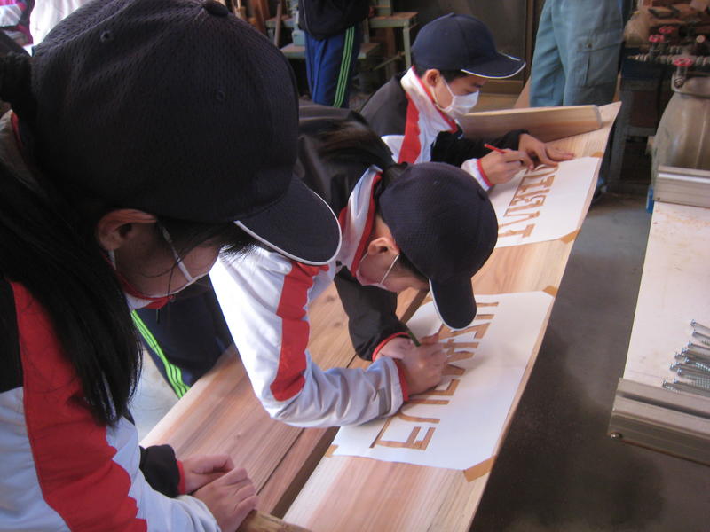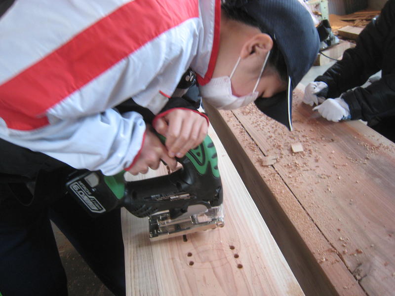 穴開けの後は、電動のこぎりの刃を差し込んで下書きに沿って校名を刻みました。