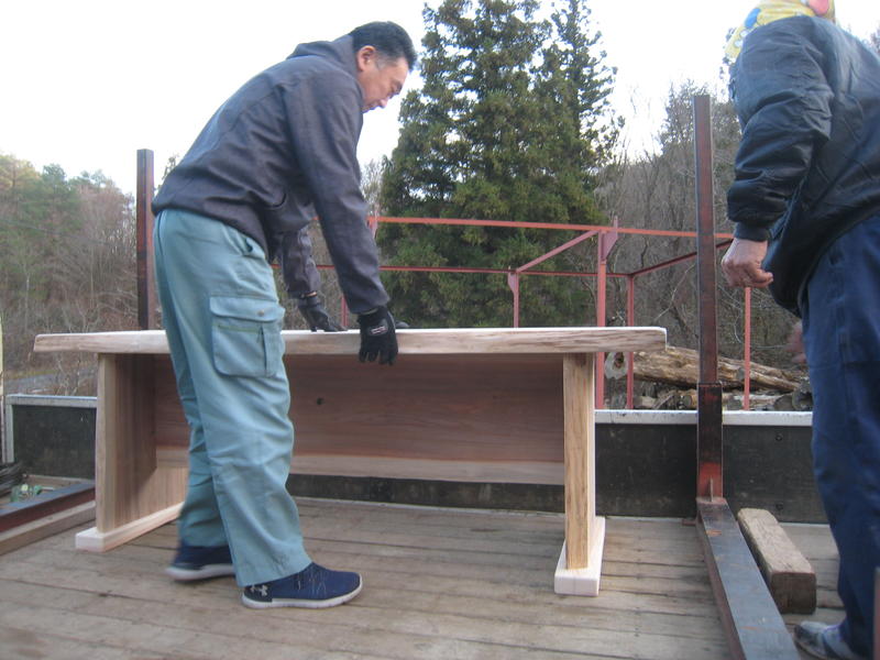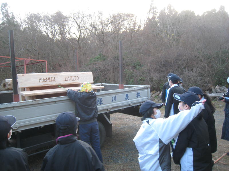 仕上がったテーブルとベンチは、緑川さんのトラックで学校まで運んでいただき保管します。