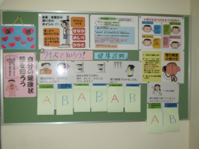 4月の保健目標は「自分の健康状態を知ろう」です。4~6月にかけて健康診断が予定されています。検査の意義・目的や受診方法をクイズにしました。また2年生理科で学習する「動物のからだのつくりとはたらき」に関連して、「体のなかみ」の中の肺・肝臓・腎臓・心臓・小腸・大腸の位置・大きさ・重さと働きについて掲示しました。