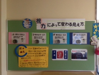 また、4月に行いました視力検査の「A」「B」「C」「D」それぞれの見え方を疑似体験できる掲示を作製しました。それぞれの見え方の指標には、10月29日に行われます音楽会で生徒たちが、今、これを目指して頑張っているものを文字として表しました。