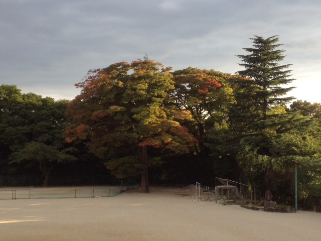 目の休養に・校庭のシンボル「けやき」も色づき始めました。