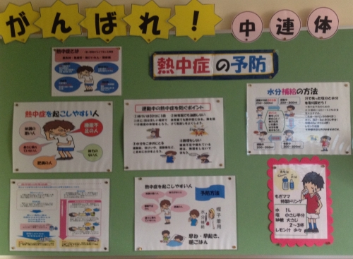 熱中症予防についての掲示です。6月に入り気温、湿度も高くなりました。そろそろ注意が必要です。