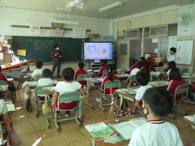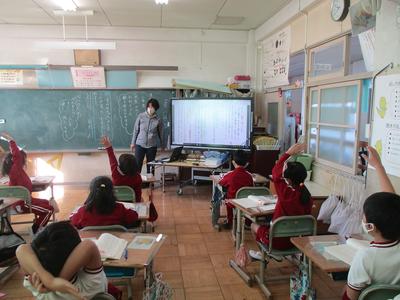 先日入った大きな電子黒板も使っています。電子黒板は、これまでの大型モニター(テレビです)と違って、画面から操作でき、画面に書き込みもできます。