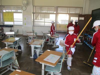 おそうじ。1年生の教室をきれいにしていました。