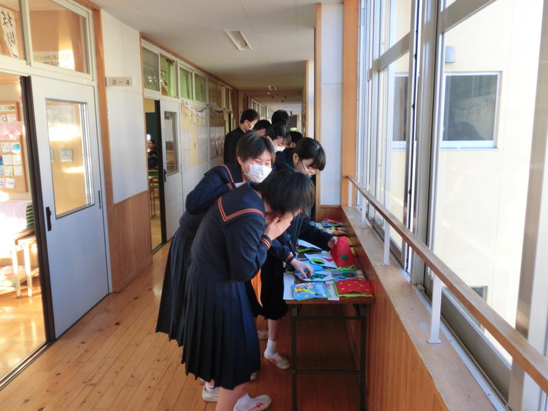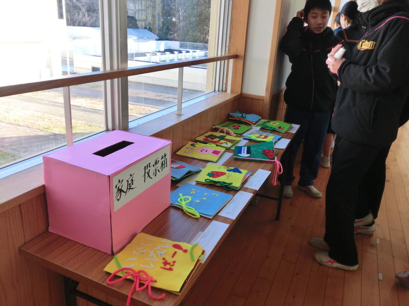 3年生は家庭科の育児の学習で遊具を作成しました。お互いの作品を鑑賞し、優れた作品を選ぶ予定だそうです。
