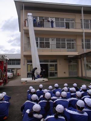 訓練後は、1学年は救助袋、2学年は消火器、3学年は煙の中での避難を、それぞれ体験しました。