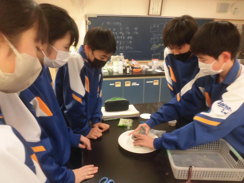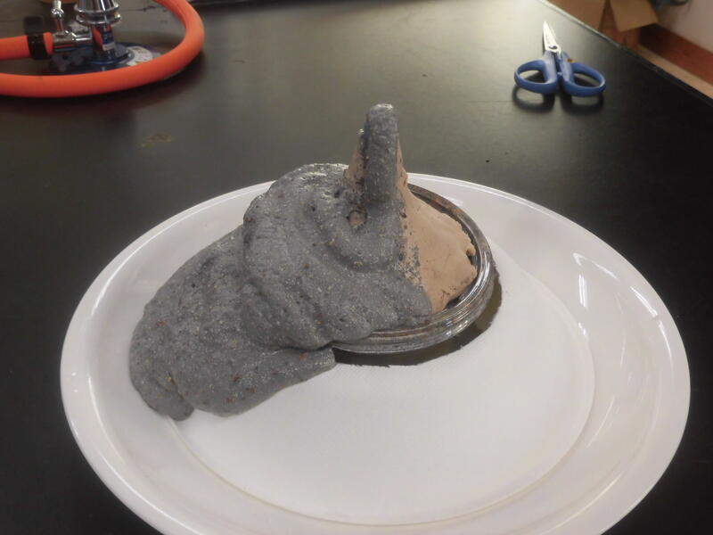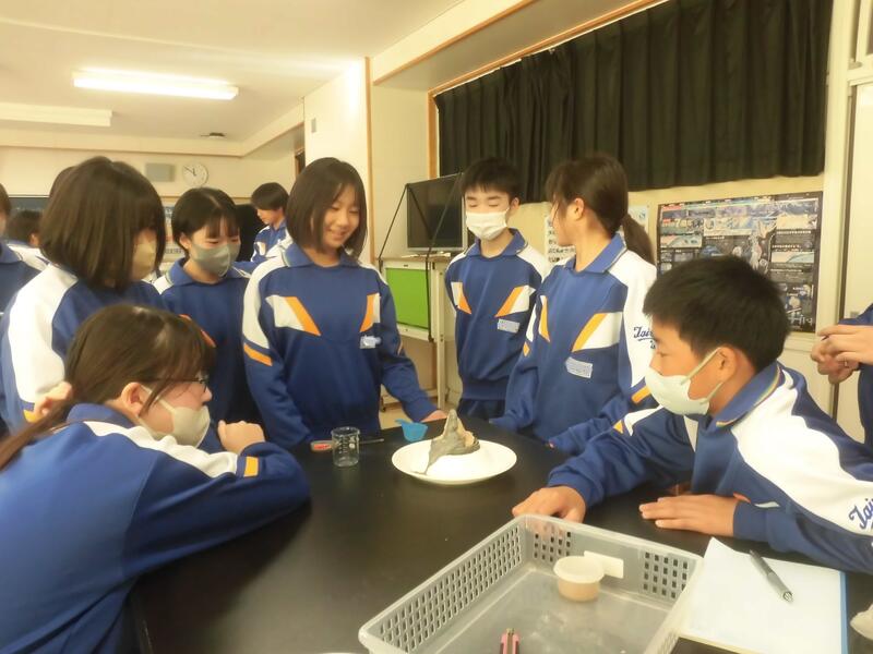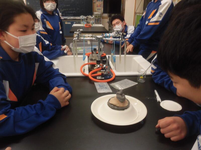 2025年1月16日 16時03分火山の噴火モデルを作製し、石こうの粘り気の違いによる火山の形を観察しました。マグマが次々と流れ出す様子に、驚いていました。