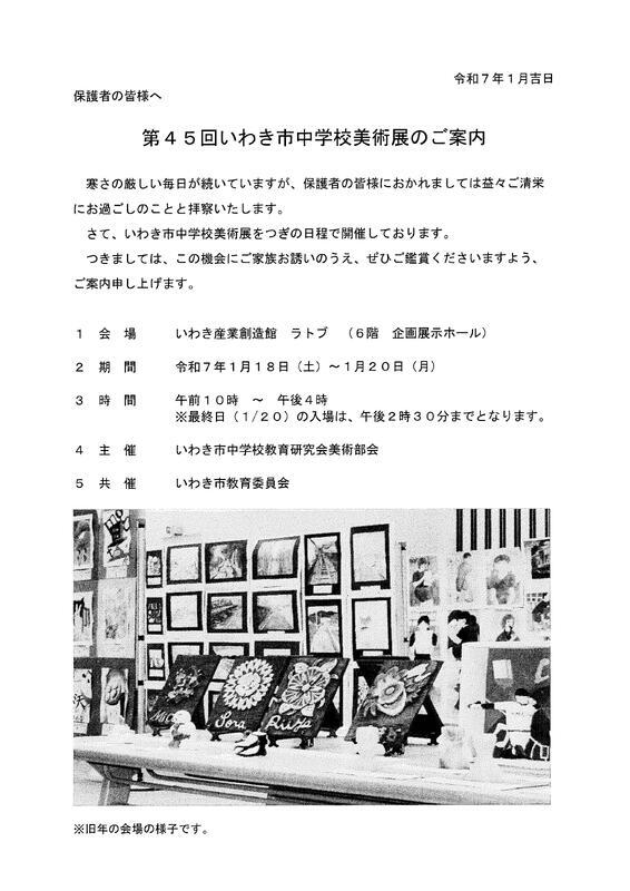 2025年1月17日 18時40分1月18日(土)から20日(月)の3日間、ラトブ6階企画展示ホールにおいて、いわき市中学校美術展が行われます。本校からも多数の生徒作品が展示されますので、ぜひお越しいただき、生徒作品をご覧ください。