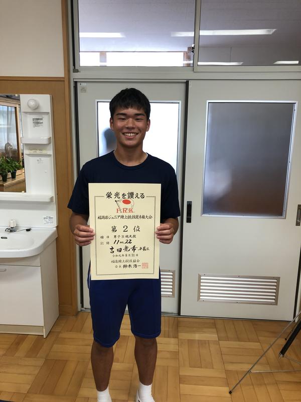 2019年9月2日 12時40分土曜日に、県のジュニア陸上競技選手権大会が行われました。本校からの参加者は、吉田光希君が、男子B砲丸投に出場し、11m22を投げて、第2位となりました。痛いとの差が、僅か数十センチでした。しかし、今後は投げる角度を工夫して、さらに良い成績を残したいと力強く語ってくれました。
