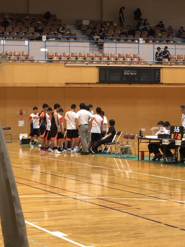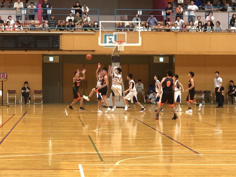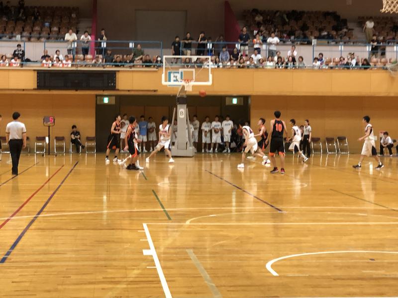 2019年7月23日 12時01分須賀川アリーナで、原町一と平二バスケ男子が戦っています。第2クオーター同点。