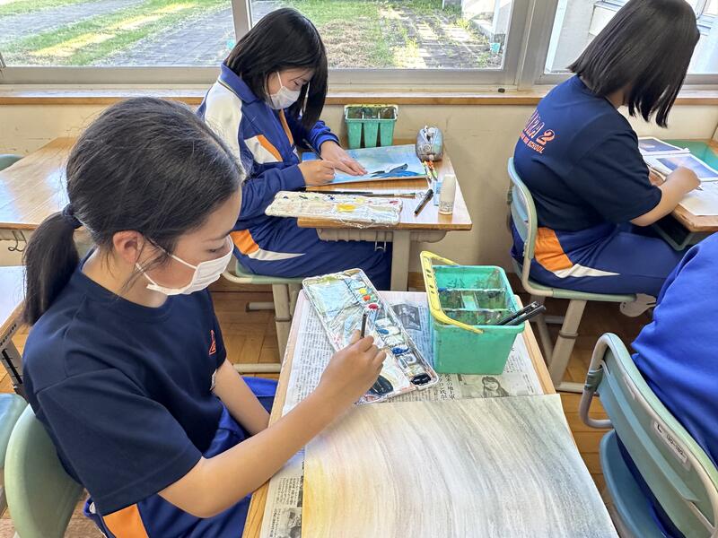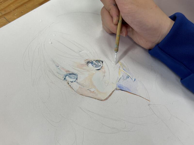 最後に個人制作の様子です。今は主に、6月に出品するコンクールに向けて作品制作をしています。思うように描けず悩む姿も見られますが、何度も練習や修正を繰り返し、諦めずに作品と向き合っています。