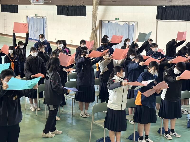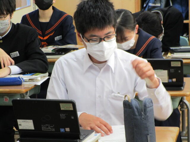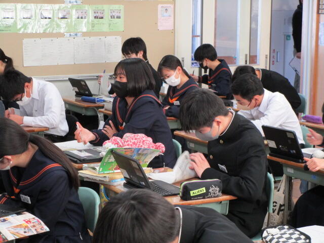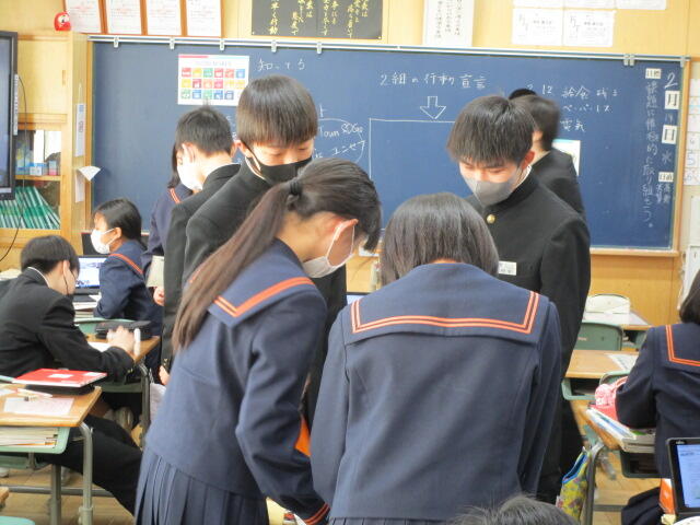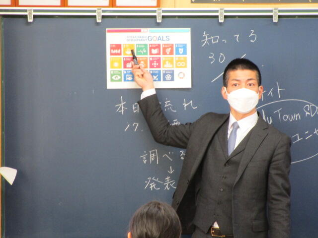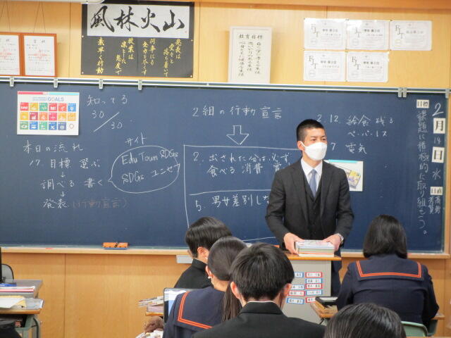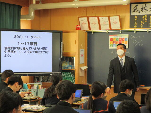 「持続可能な世界にしていくためには」というテーマのもと、SDGsについて考えました。日頃からできる小さな積み重ねが、持続可能な世界を実現していくために必要なことであることを学び、生徒たちは実践意欲に満ち溢れた様子でした。