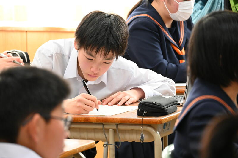 確率の知識を用いて、くじの当たりやすさに違いがあるのか、級友と相談しながら考えを深める生徒たちの姿が見られました。
