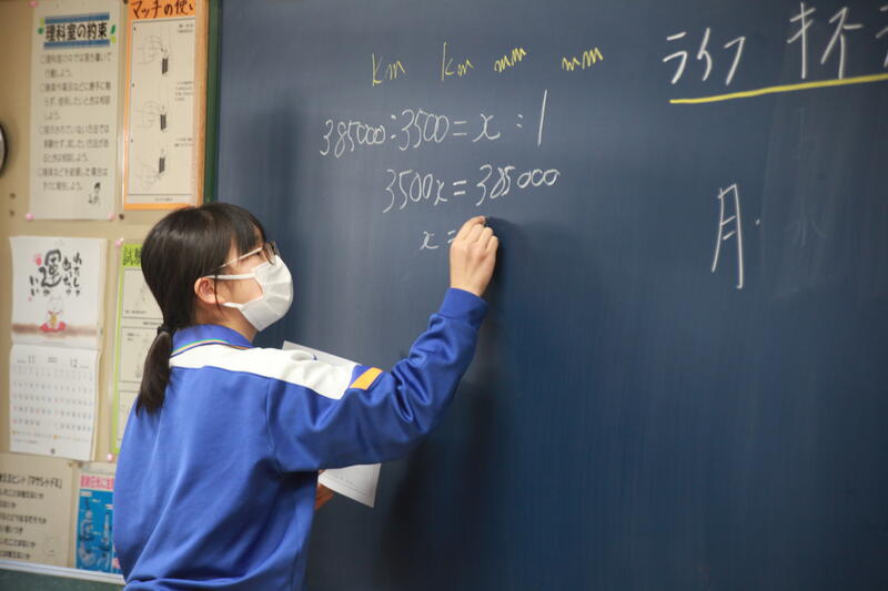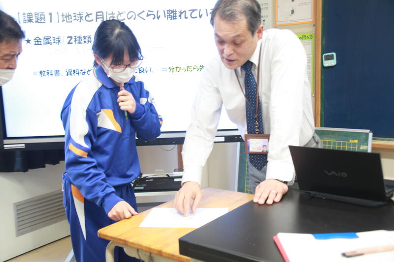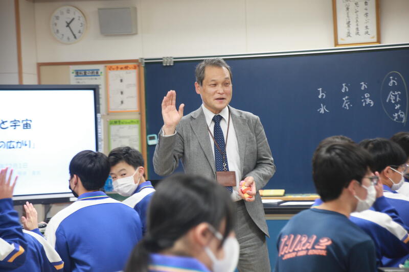 筑波大学附属中学校副校長の新井直志先生が、3年3組の生徒に「宇宙の広がり」の授業をしてくださいました。多くの先生方に囲まれていましたが、地球と月の距離や地球と木星の距離について、真剣に考え、活発に発言する姿がみられました。宇宙の広さを実感出来たと思います。これからも広大な宇宙、天体の学習を楽しんでほしいと思います。