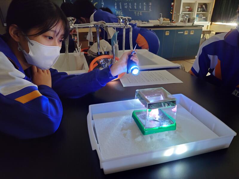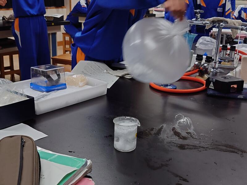 昨日行われた一年生対象の放射線教育のドライアイスをいただきましたので、急きょ簡易霧箱で放射線を見ることにしました。また、ナイロン袋に入れてふくらませたり、水に入れたりして、楽しみました。
