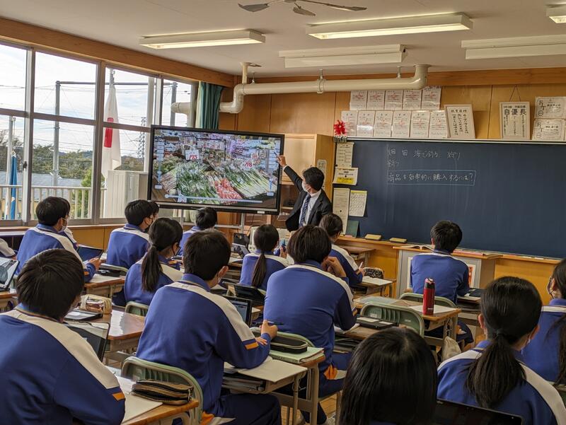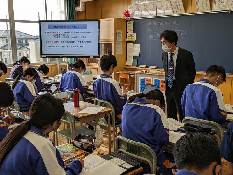 2023年11月13日 17時20分2校時目に3年3組で研究授業が行われました。生産者と消費者を結ぶ業者の役割を理解し、さまざまな角度から、商品を効率よく流通させる方法について考えました。タブレット(ムーブノート)に自分の意見を書き、班やクラス全体で共有しました。一消費者として、商業への関わりを考えるよい機会となったようです。