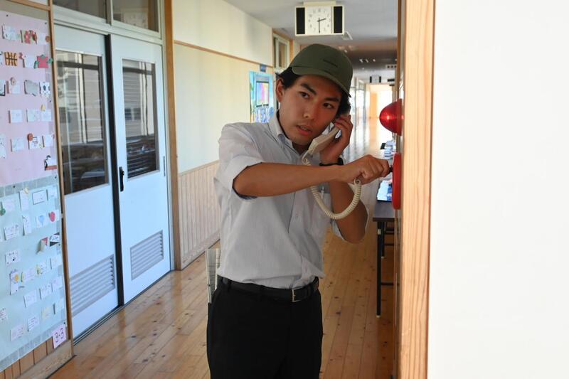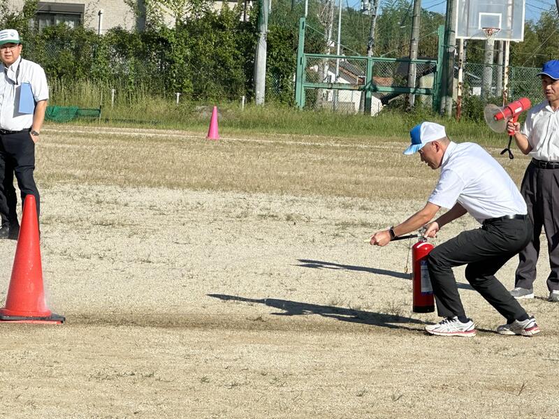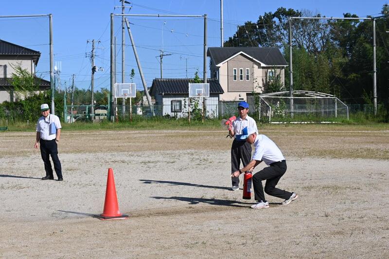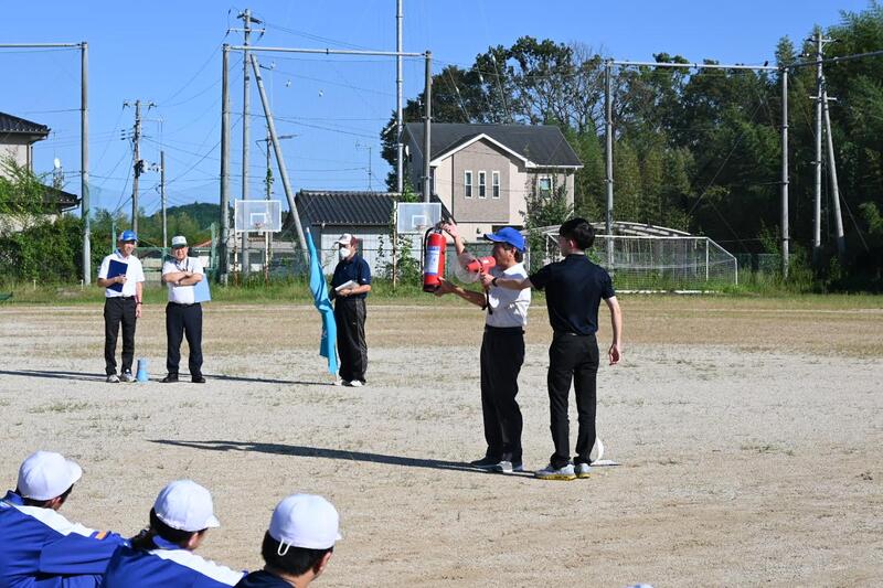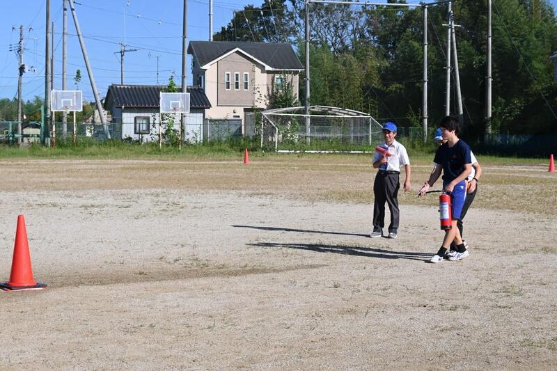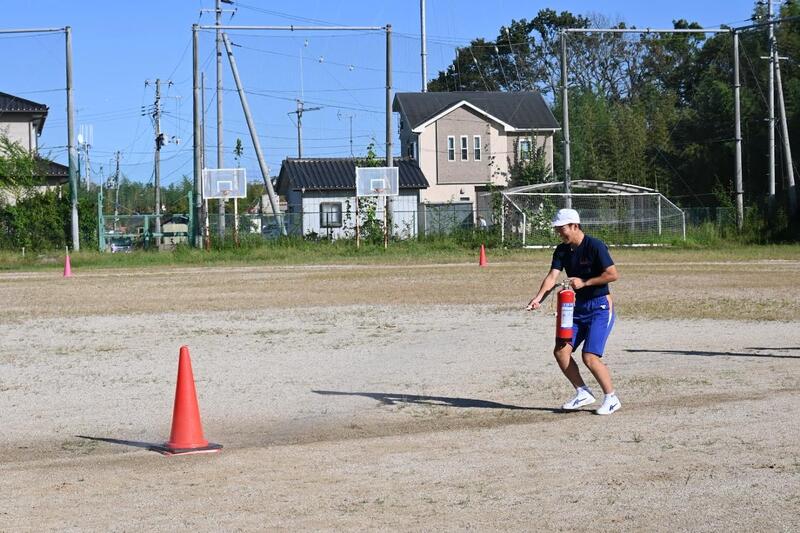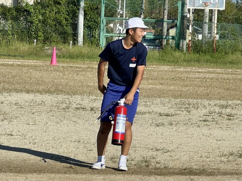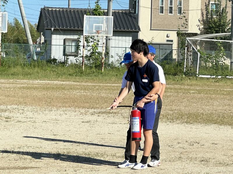 避難後は、消化器の使い方を学び、代表生徒が数名、消火体験をしました。