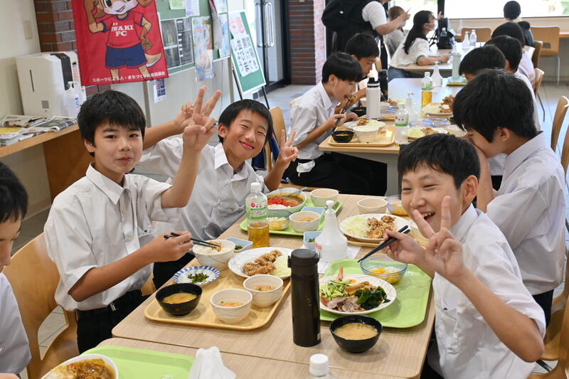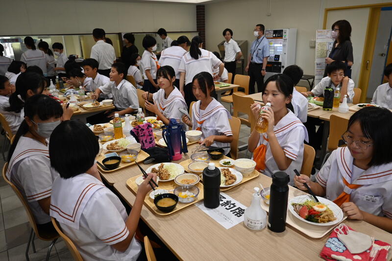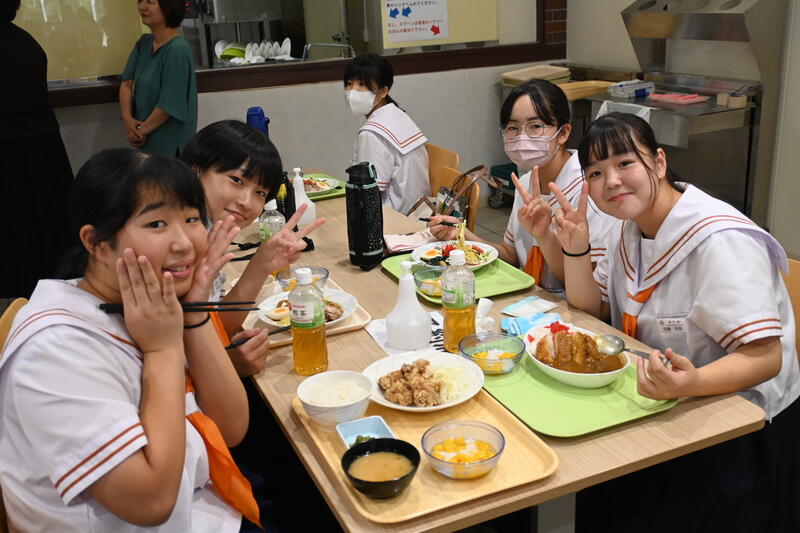 施設見学後、昼食の時間には、大学の学食を全員で食べました。それぞれ、唐揚げ定食、カツカレー、そして冷やし中華の中から食べたいものを選んで食事をいただきました。