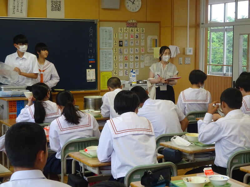6/15(木)に給食センターの職員3名がいらっしゃり、給食の準備や食事、後片付け等を見ていただきました。