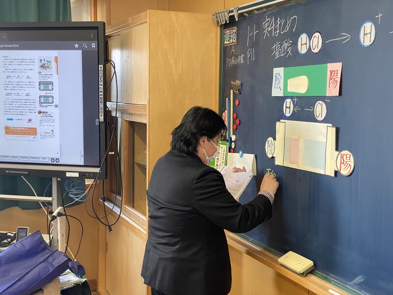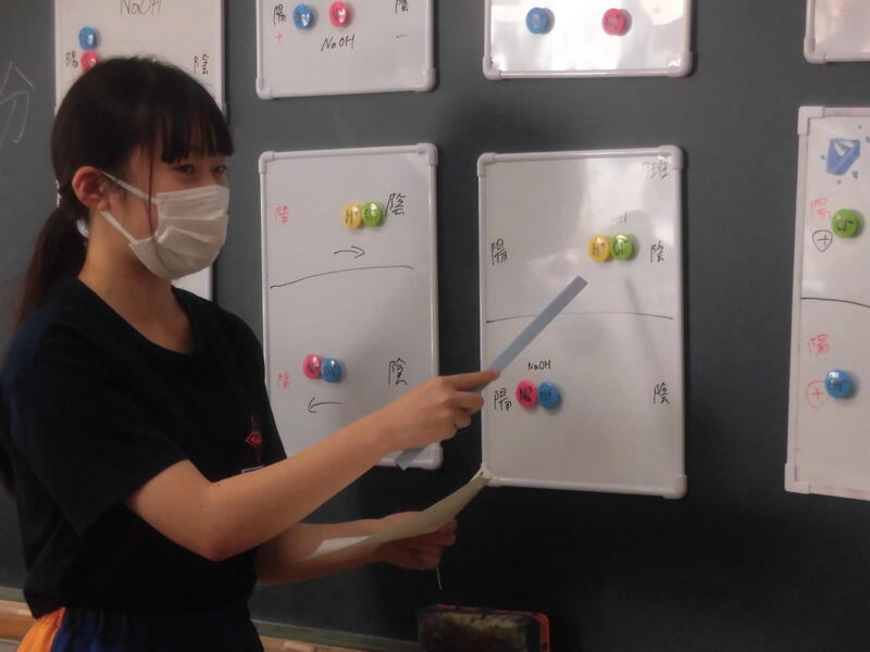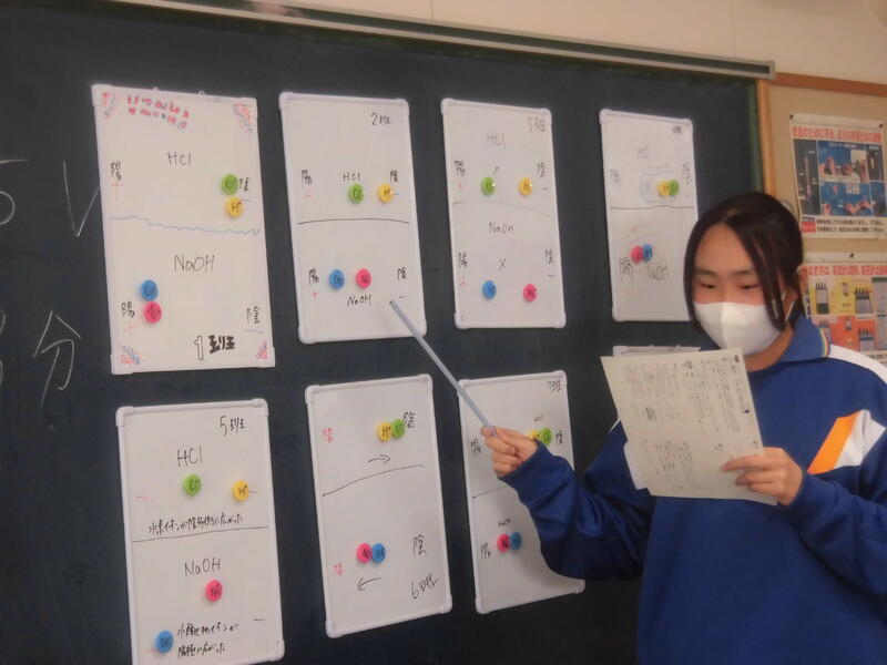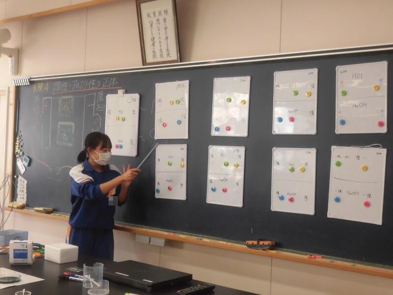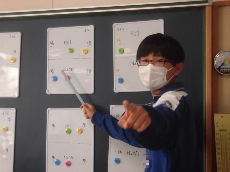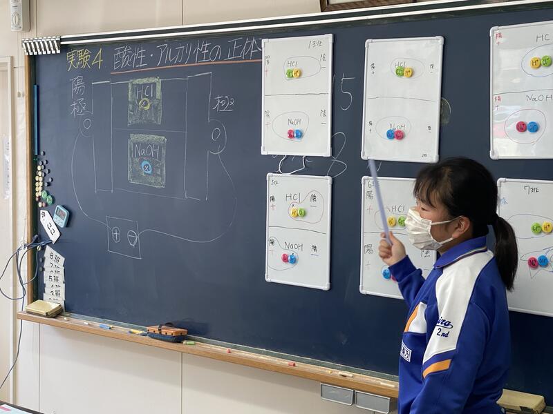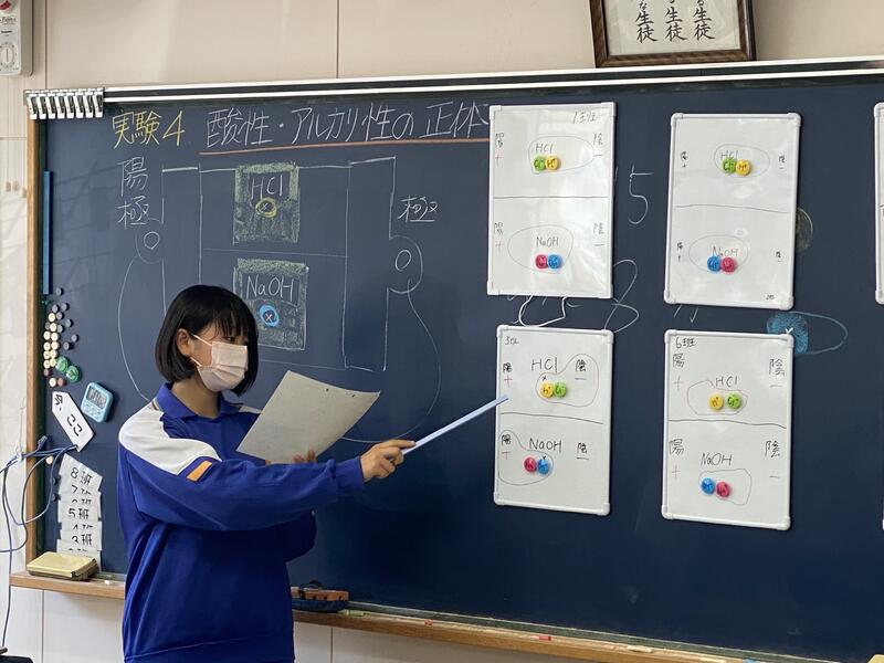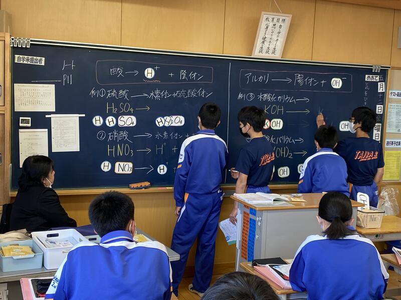 本日3年生の理科では、酸性、アルカリ性の正体を調べる実験をしました。イオンのモデルを使用し、各班で考察しました。