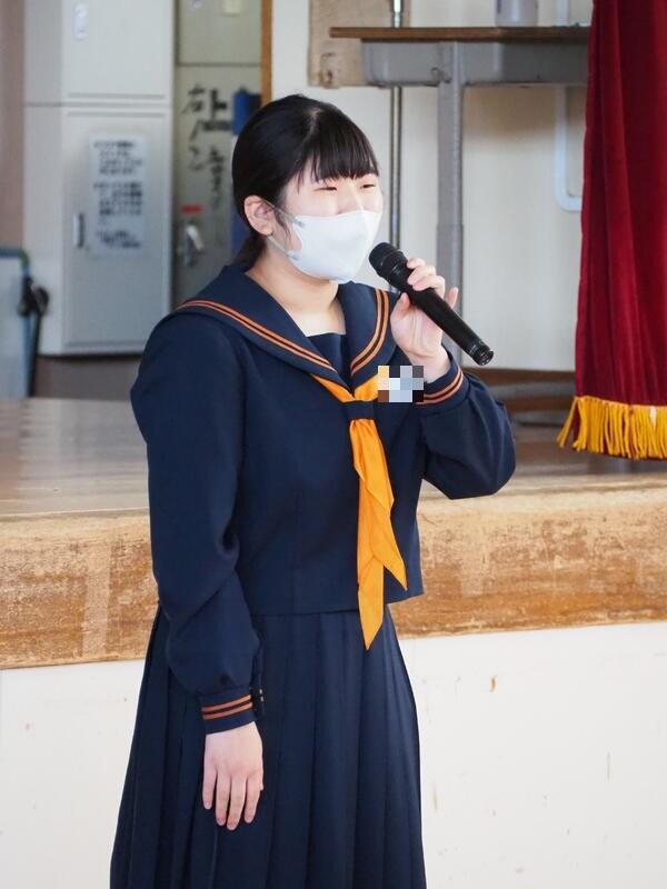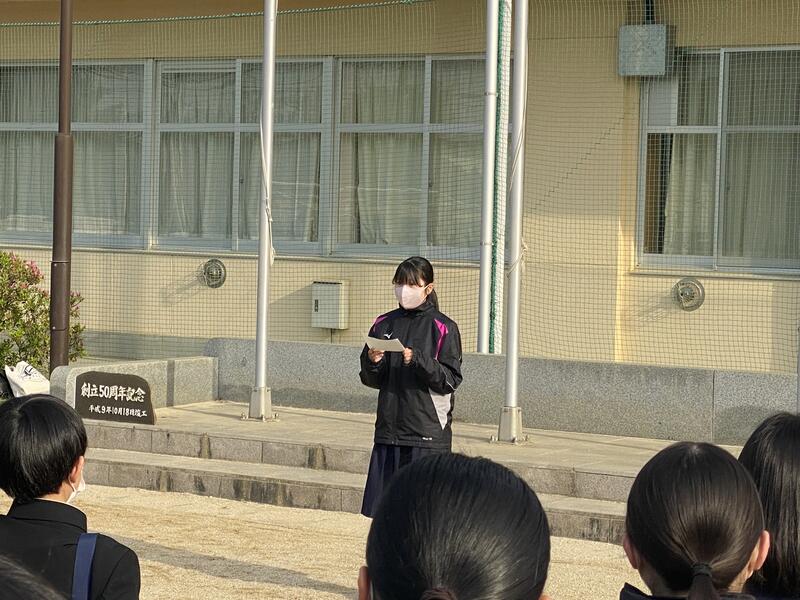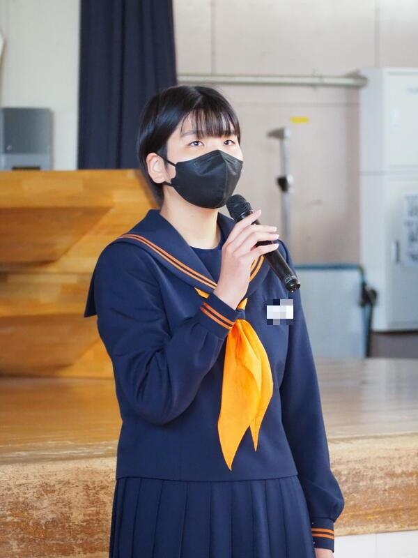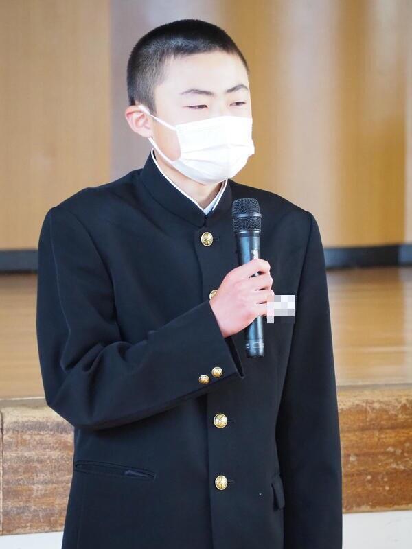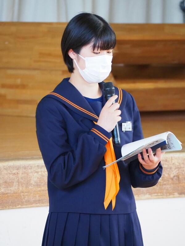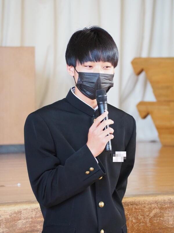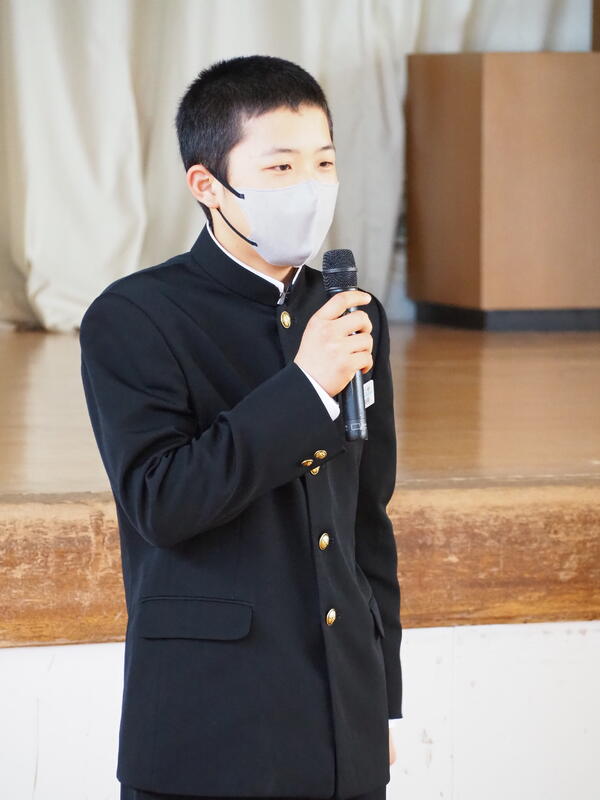 生徒代表挨拶。マナーとルールを守り、お互いの良さを知りましょう。