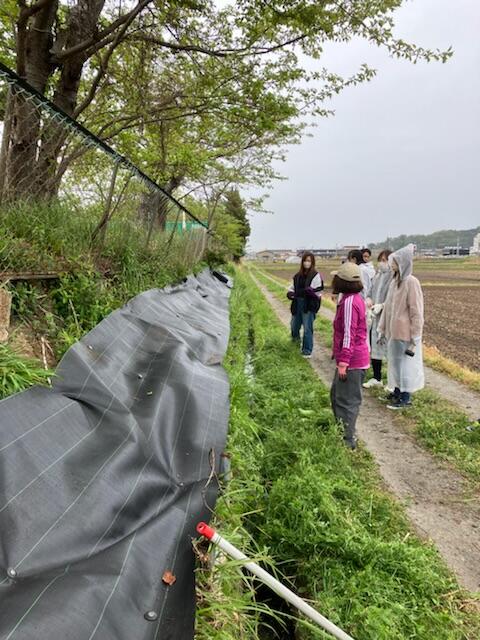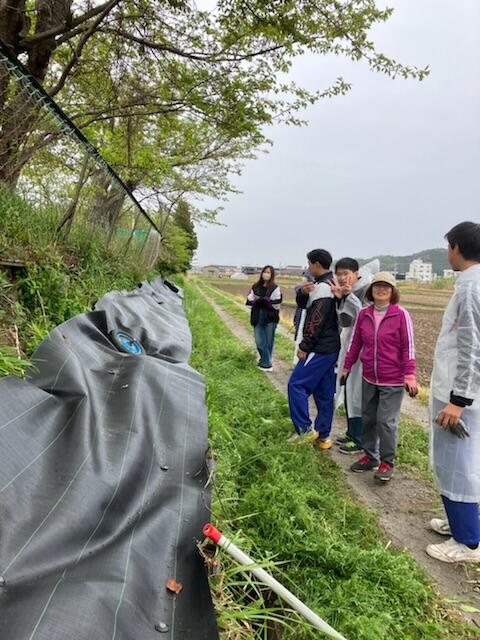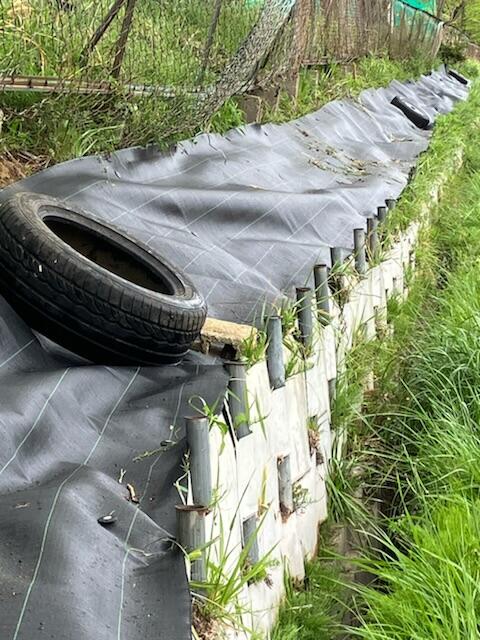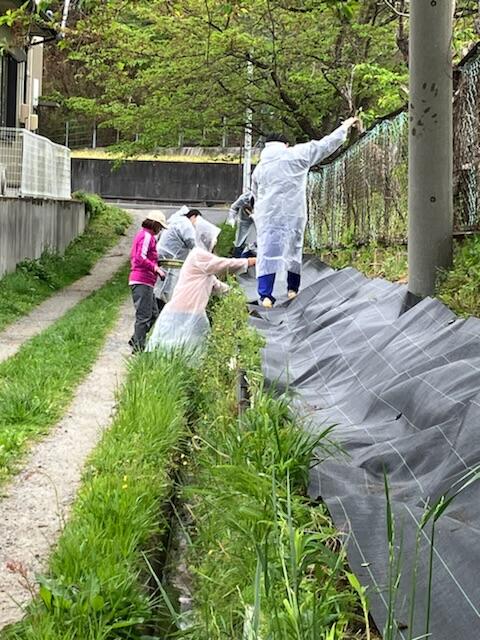 雨が降る中、陸上競技部保護者の皆様及び3年生男子の協力を経て、簡易ではありますが法面に防草シートを被せることができました。