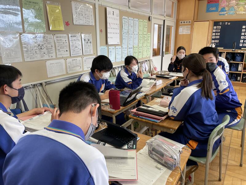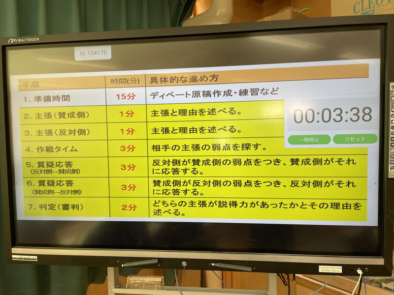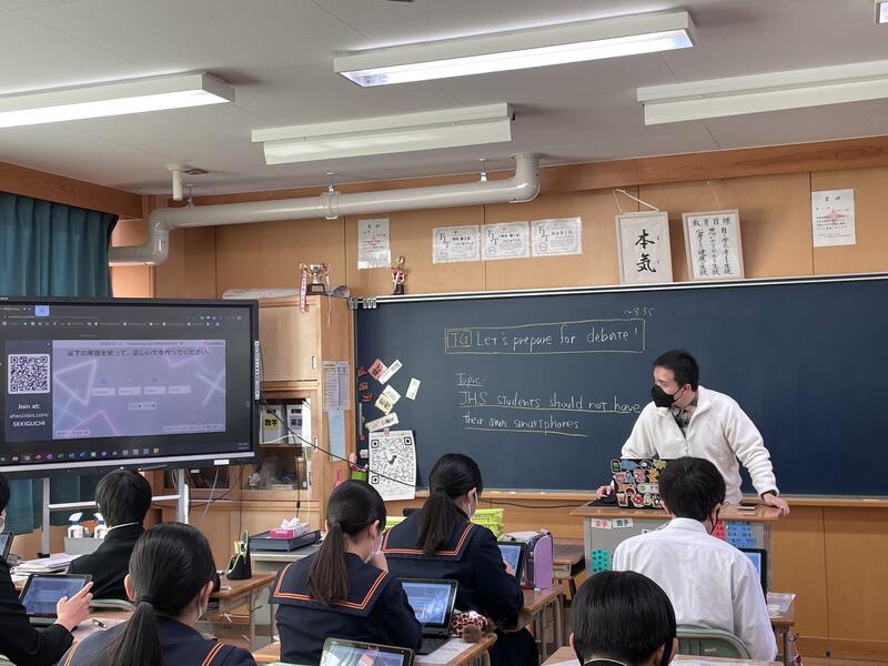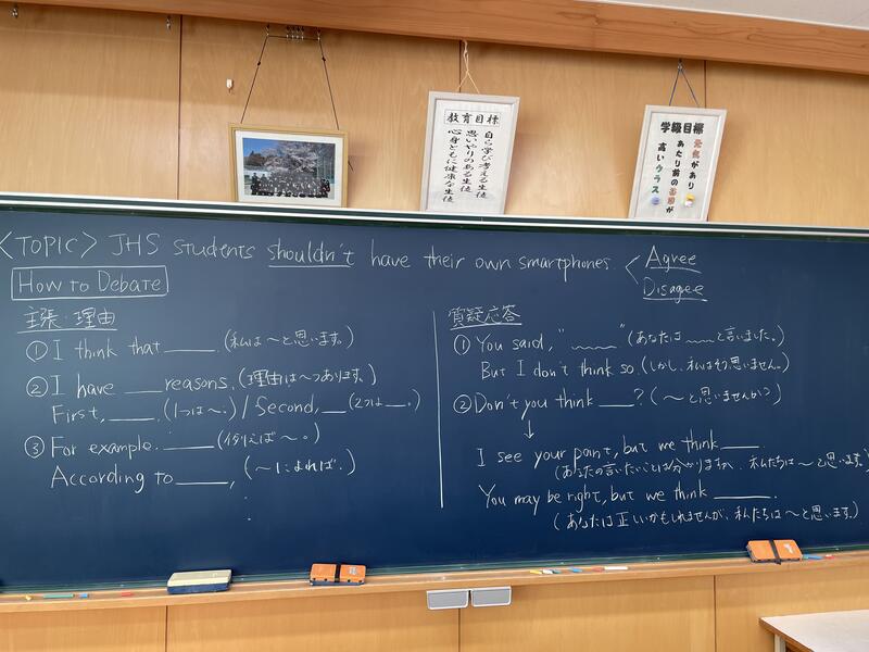 英語でディベートする授業では、"JHS students should not have their own smartphones."を論題に、賛成側と反対側に分かれてディベートに挑戦しました。さらに、ジャッジや進行管理も生徒自身が行いました。