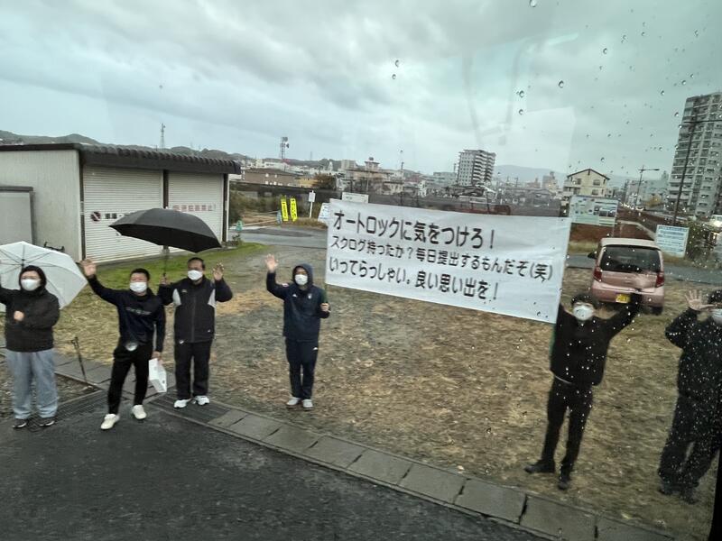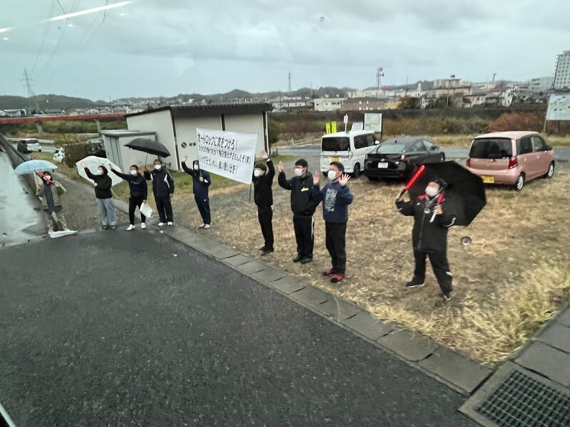 2022年11月15日 07時42分 修学旅行に6:50無事出発しました。あいにく雨が降り出す中での出発になりましたが教職員及びPTA役員に見送られながら笑顔で出発することができました。
