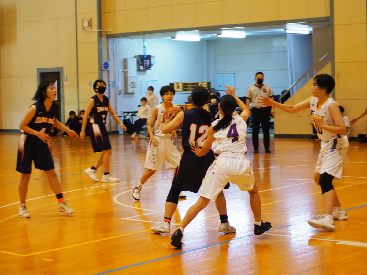そして決勝で迎えた相手は、泉中。中体連の決勝と同じ顔ぶれとなりました。中体連では準優勝と悔しい思いをしましたが、悔しさをバネに部員たちは練習に励んできました。結果は50-59で見事優勝!昨年度に続いて2連覇となり、優勝旗が学校に戻ってきました!