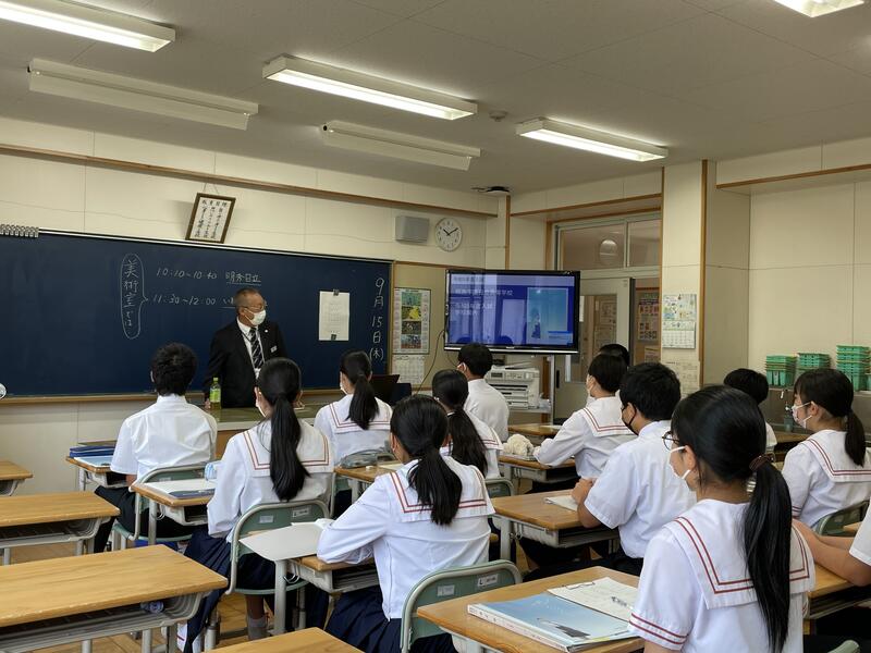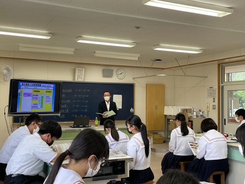 本日9/15(木) 、3年生と保護者を対象に高等学校説明会を実施しました。市内の高等学校・高等専門学校より校長先生方にお越しいただき、各学校の特色について説明していただきました。