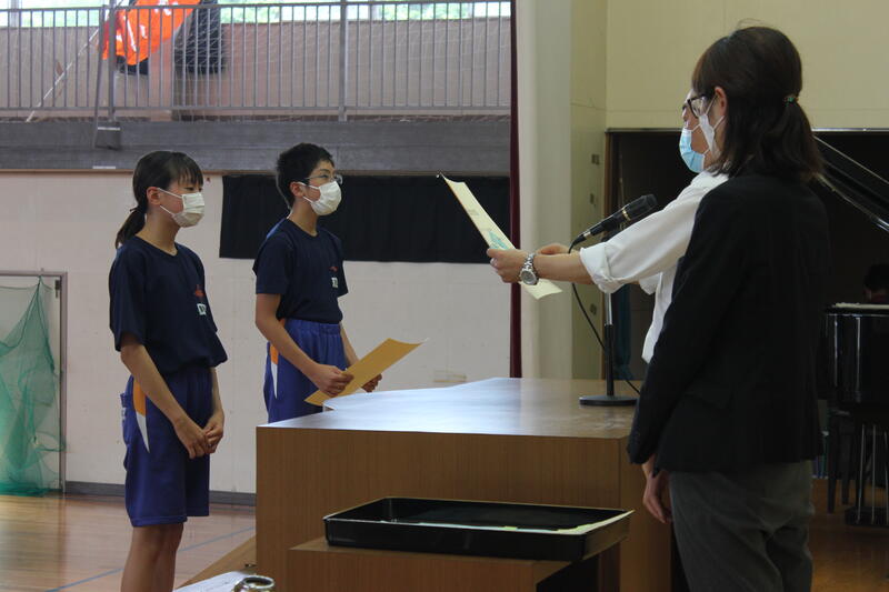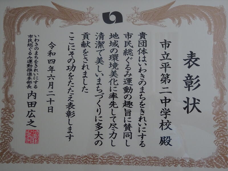 2022年6月29日 17時21分平二中の長年の地域の環境美化活動が評価され、いわきのまちをきれいにする市民総ぐるみ運動推進本部長様より表彰状をいただきました。ありがとうございました。