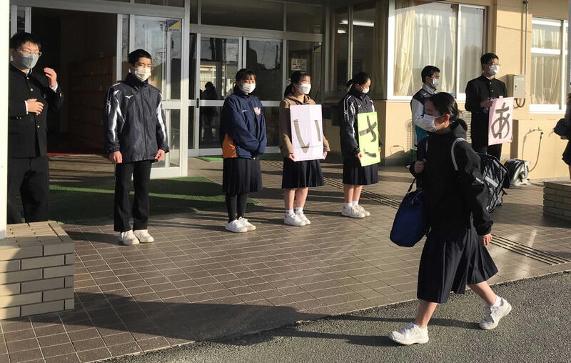 2月21日(月)、登校時間帯の玄関前の様子です。