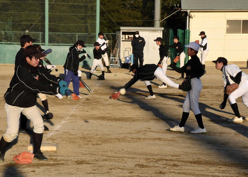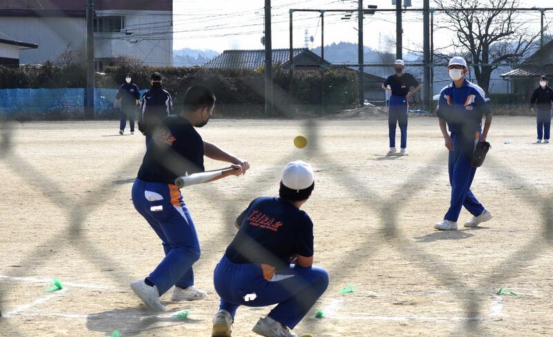 ぽかぽか陽気の午後、校庭では保健体育でソフトボールの授業を行っています。あたたかな日差しの中、半袖ジャージの生徒も多く見られます。