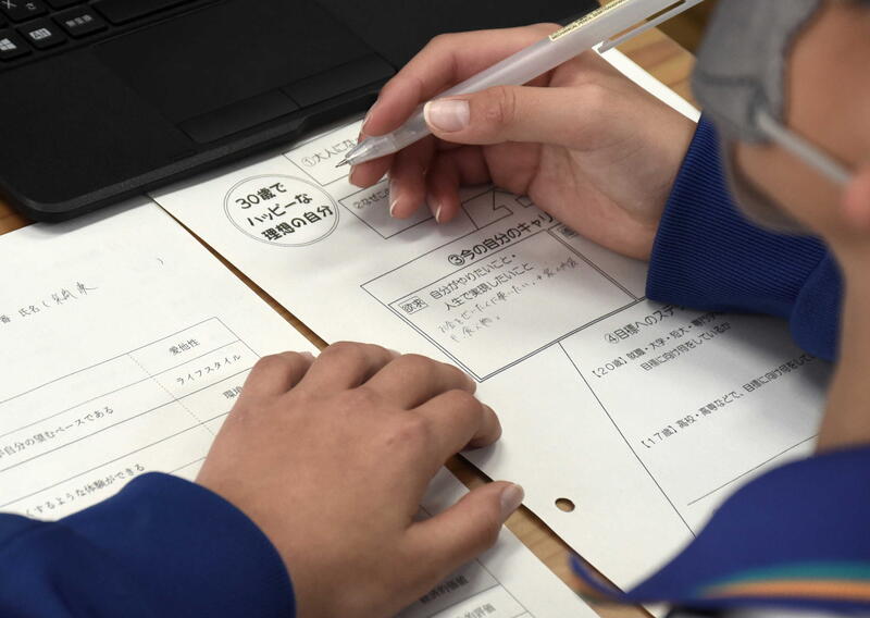 キャリアプランニングを通して、生徒たちに自らの進路について具体的に考える動機付けをし、希望実現のために何が必要かを考えさせることをねらいとした授業でした。