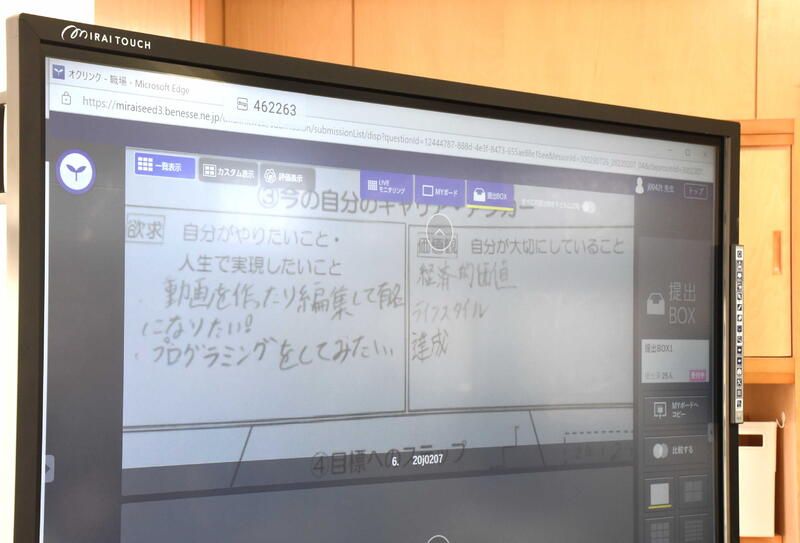 生徒たちがワークシートに記入した内容は、タブレット端末で写真に撮り、提出ボックスに送ることで、皆で共有しました。