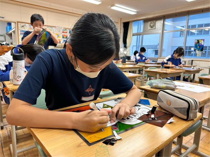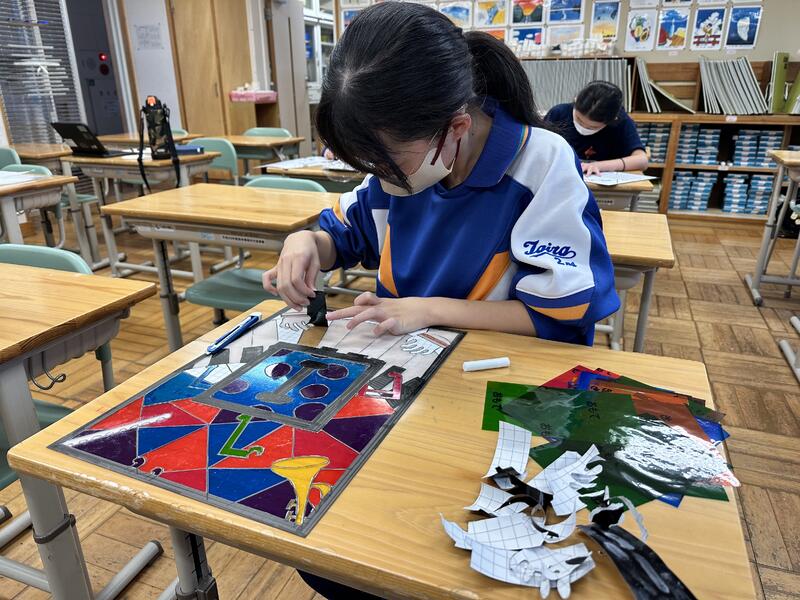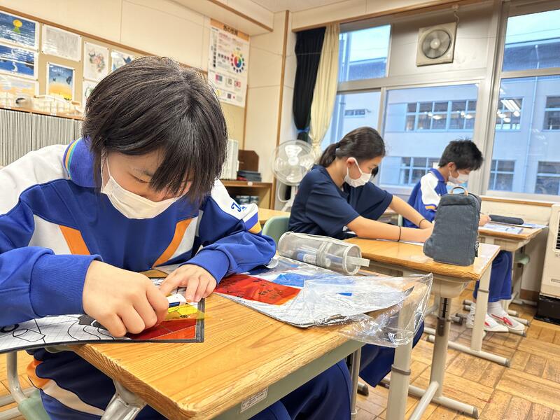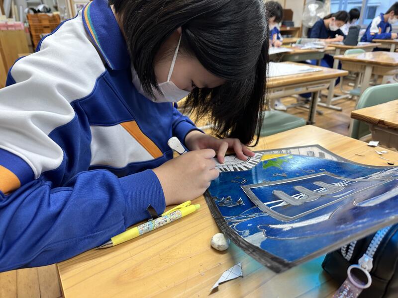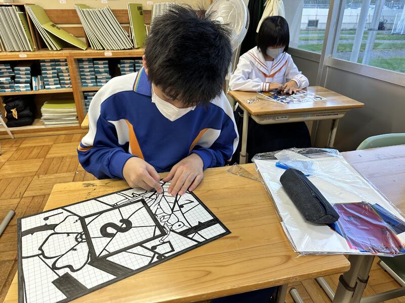 まずは「ステンドグラス風作品」制作の様子です。カッターを使用した制作のため、かなり集中して作業しています。来週校舎内に展示予定です。お楽しみに!