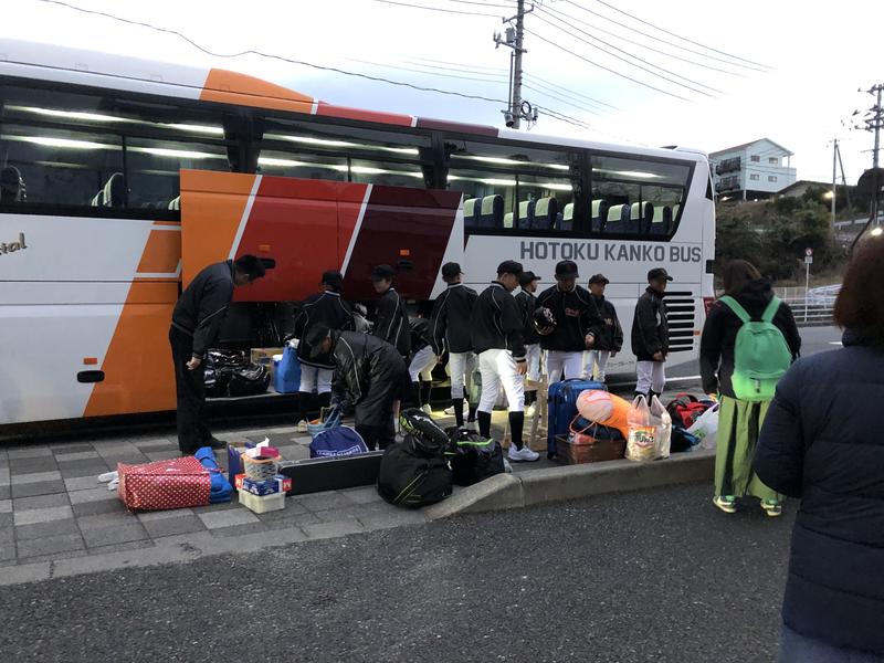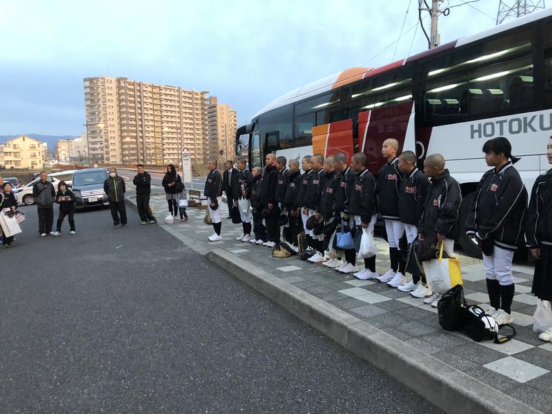 朝5時半。学校下のバス停です。これから、平二中野球部員は、全国大会決戦の地、静岡市草薙球場に向かいます。