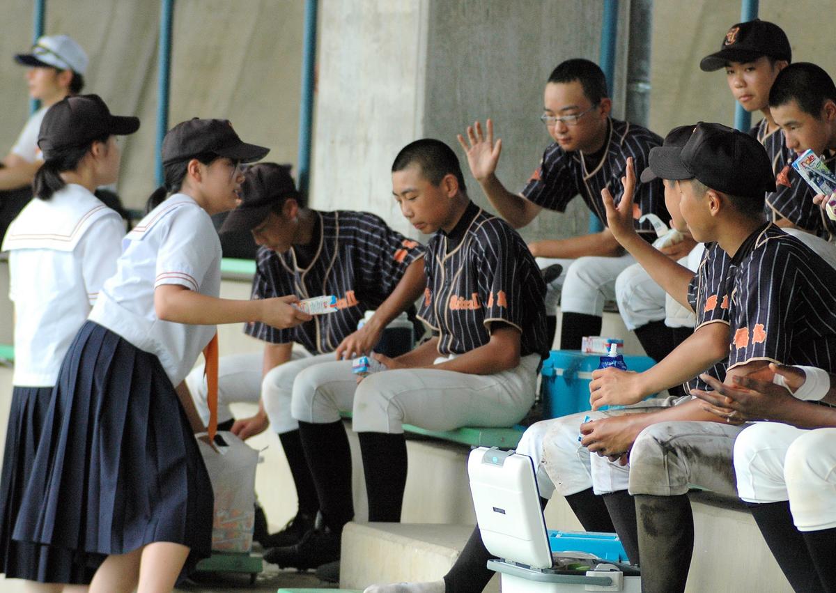 選手たちは、束の間の休息で、水分や塩分・糖分を補給しました。女子マネージャーが選手をよくサポートしていました。