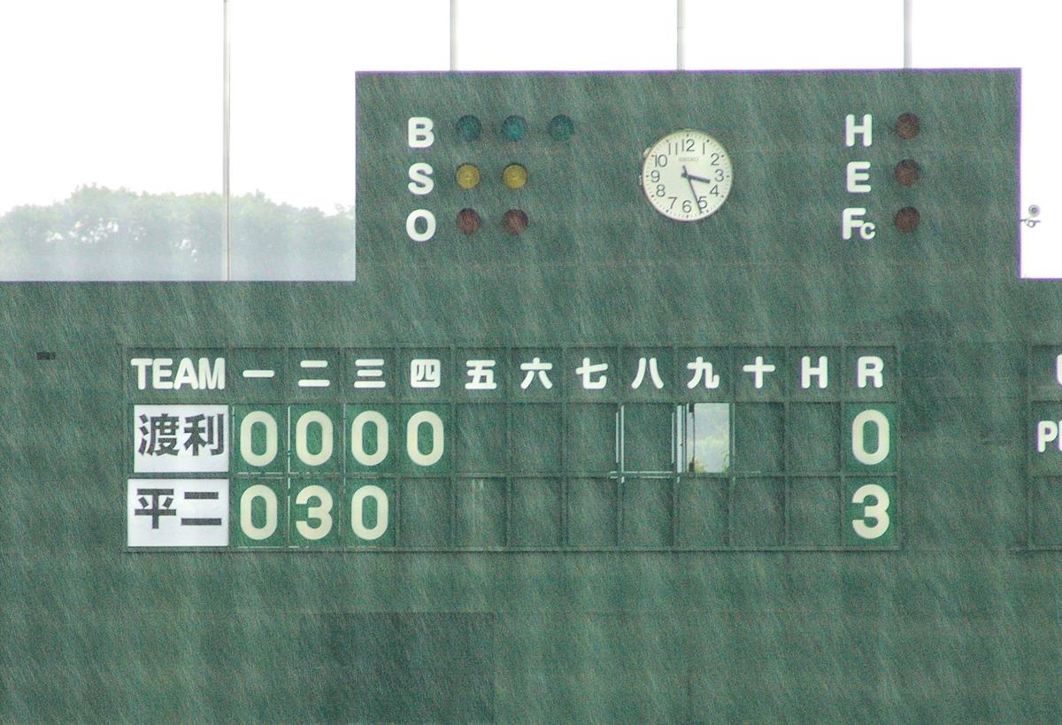4回まで平二中が3点をリードしましたが、雷鳴のためゲームは中断されました。しばしダックアウトにて待機しましたが、その後、車軸を流すような土砂降りとなり、本日のゲームは中止となってしましました。